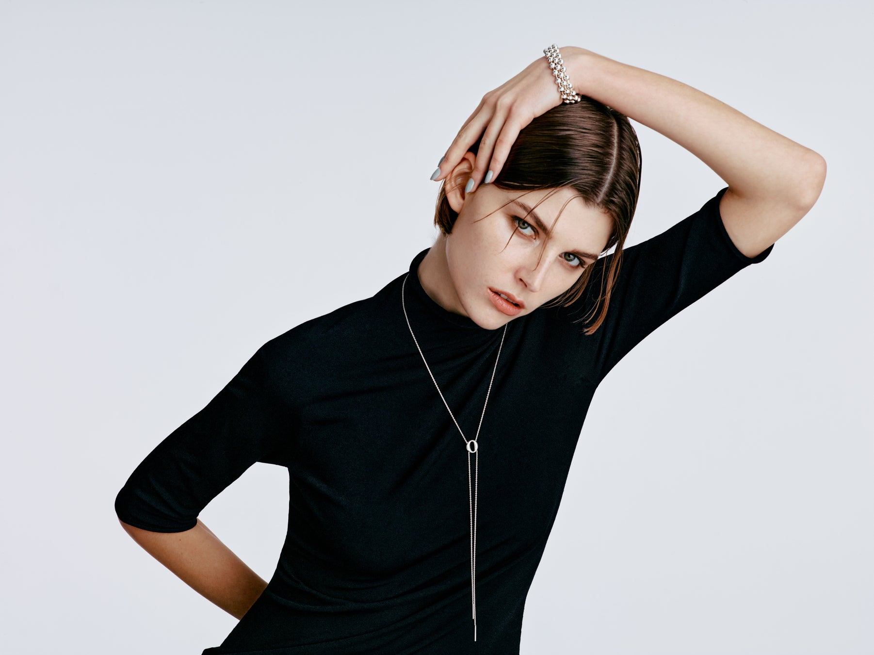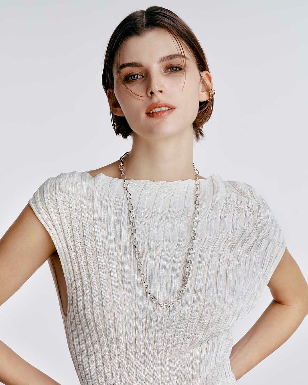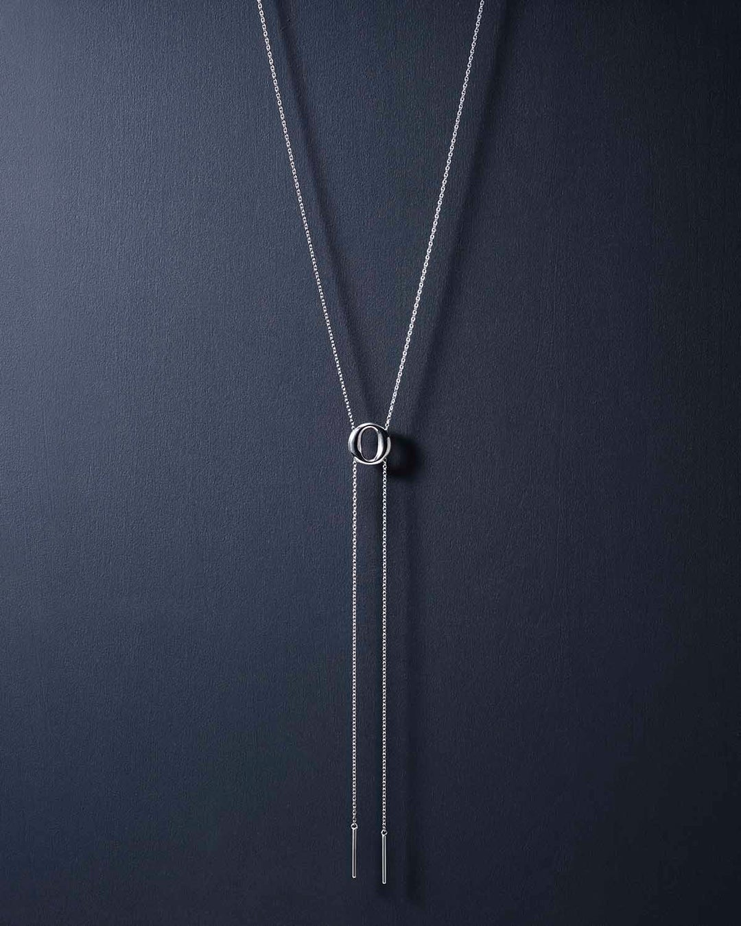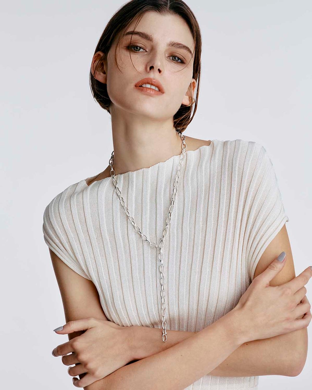 下がるチェーンを長く見せると、縦のラインが強調されモダンでシャープなシルエットが完成。スライドパーツを下げると首回りにV字の空間ができ、すっきりとした着用の印象に変えられます。