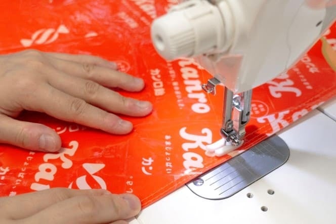 グッズのベース部分は職人が一つひとつ手作業で廃棄包材を分解し、シート状にして丁寧に縫い上げます。バッグやサコッシュは中身が取り出しやすいように裏生地を付けてシートに厚みを持たせ、ペンケースは逆にパッケージの透かしを活かすなど、アイテムによって質感が異なる点もこだわりポイント。さらに同じグッズでも包材のどの部分が使われるのか柄の配置が異なるため、世界でひとつだけのアップサイクルグッズとしてお手元にお届けします。
