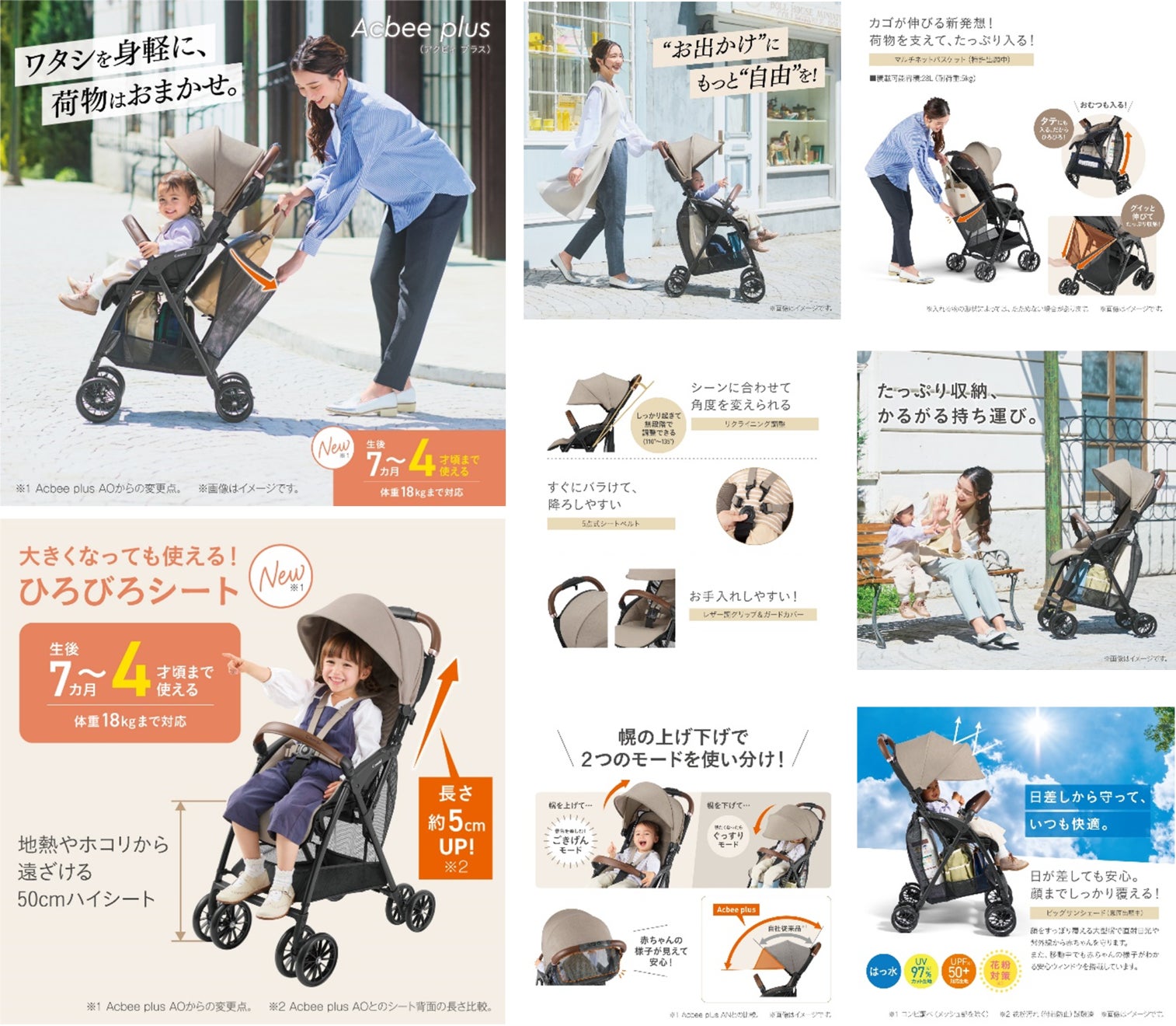 コンビの「Acbee plus MA」は、お子さまの腰がすわった生後7カ月頃から4才頃(体重18kg以下)まで使えるB型ベビーカーです。3kg台の軽量車体ながら、おむつまで入れられるたっぷり収納の伸びる大型荷物カゴと顔まですっぽり覆える長さの大型幌を備えています。