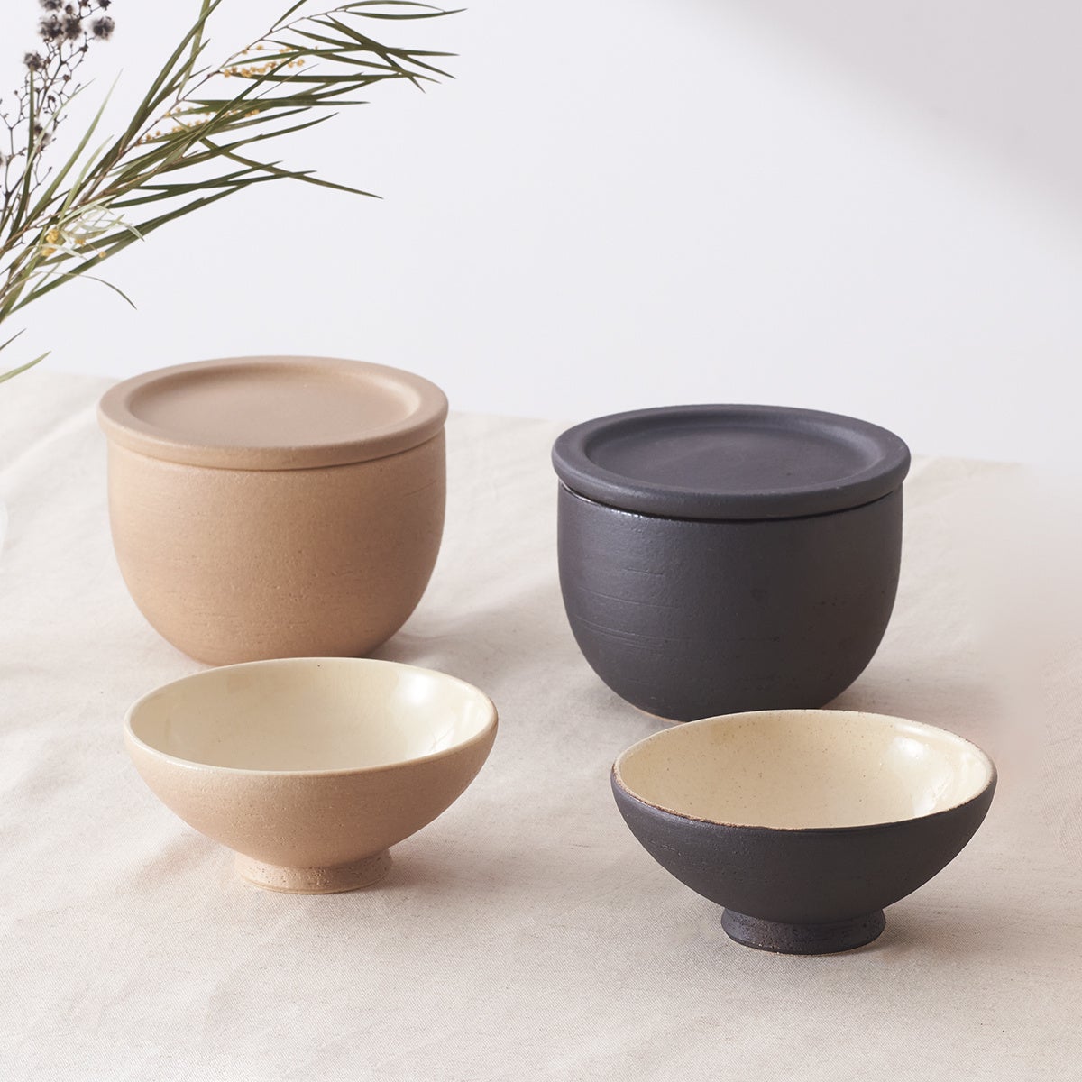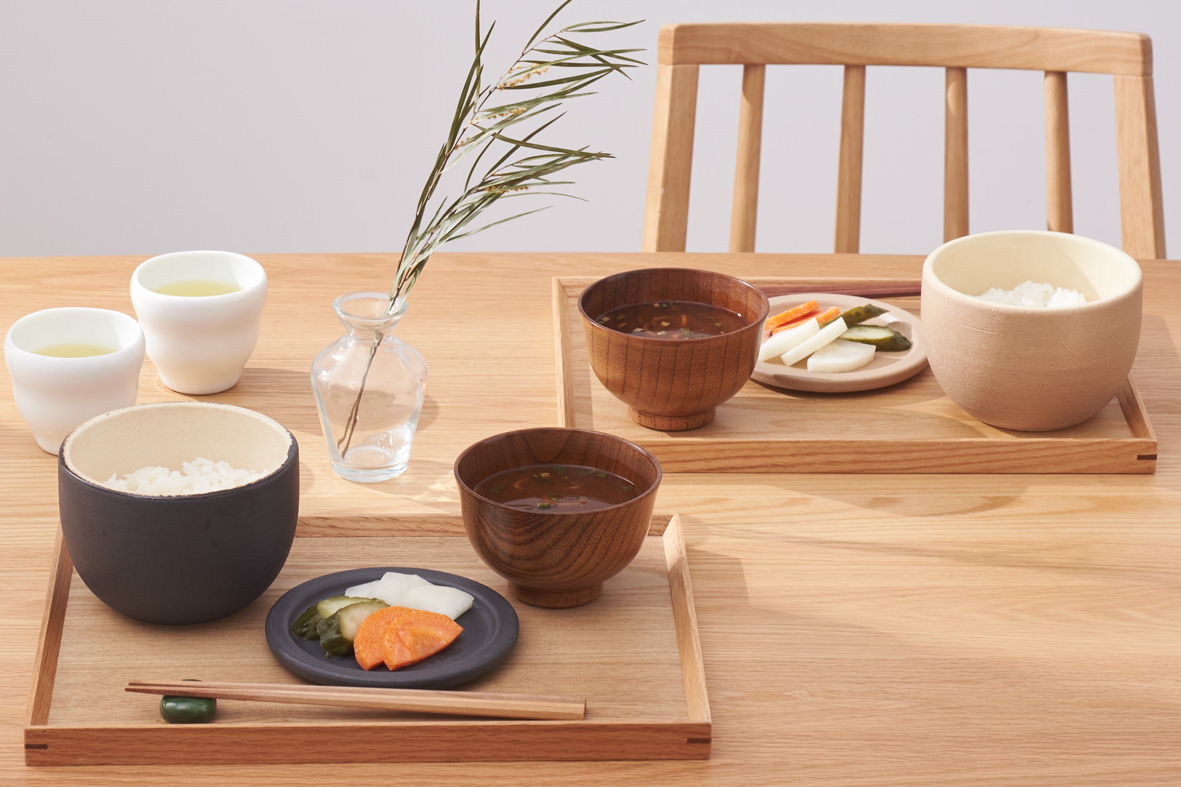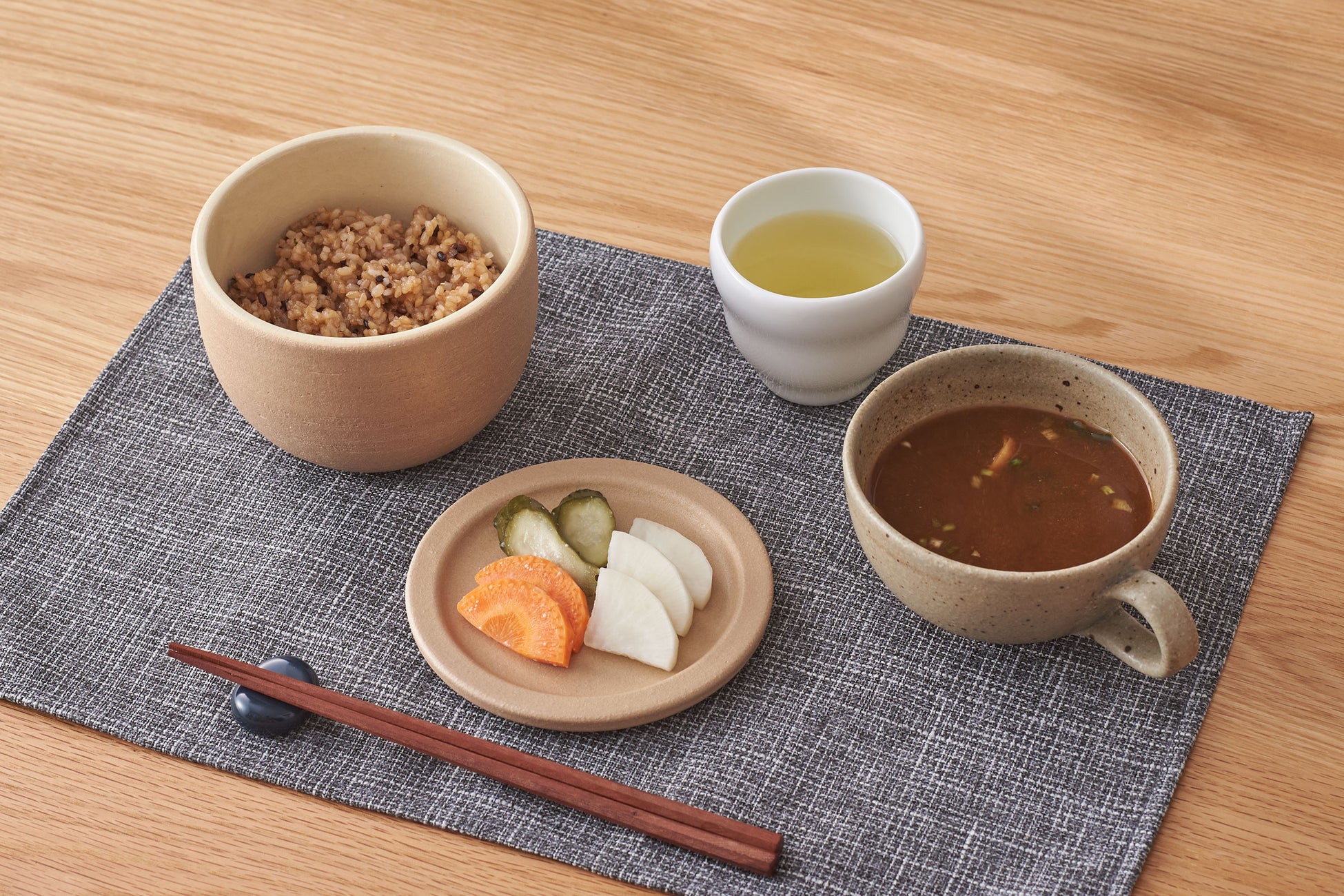 「信楽の土 おひつ」と「信楽の土 茶碗」は、器の表面をコーティングする釉薬を内外で変え、外側は高級感のあるマットに、内側はご飯がくっつきにくく洗いやすいよう、ツヤ仕上げにしました。