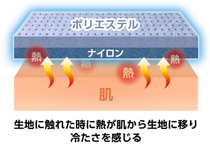 「iCOOL接触冷感UV Tシャツ」は、熱が移動しやすいナイロン生地に、水分と反応して吸熱するキシリトール加工を施しています。生地に触れた肌の熱が生地へと移り、ひんやりとした冷感効果を感じられます。ジメジメとした季節や室内でも汗ばむ日に肌の不快感を抑制し、快適にお過ごしいただけます。