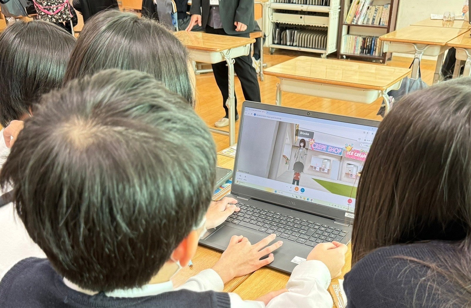 この授業では、児童たちがタブレットを使い、海外のショッピングモールや空港を再現したメタバース空間で、楽しく実践的な英会話を体験しました。