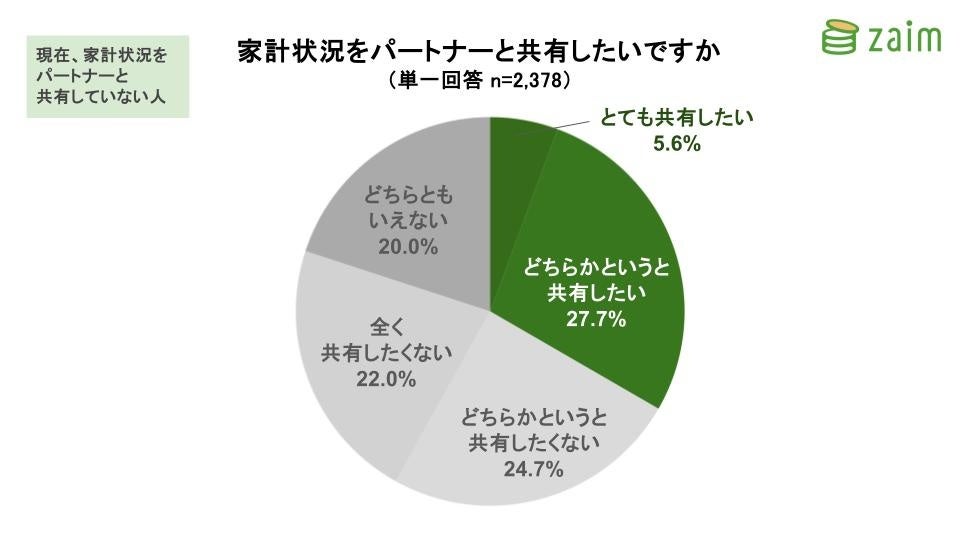 一方、現在家計状況を共有していない人についても、「とても共有したい」「どちらかというと共有したい」を合わせた33.3%、3人に1人が「本当は共有したい」という気持ちをもっていることがわかります。
