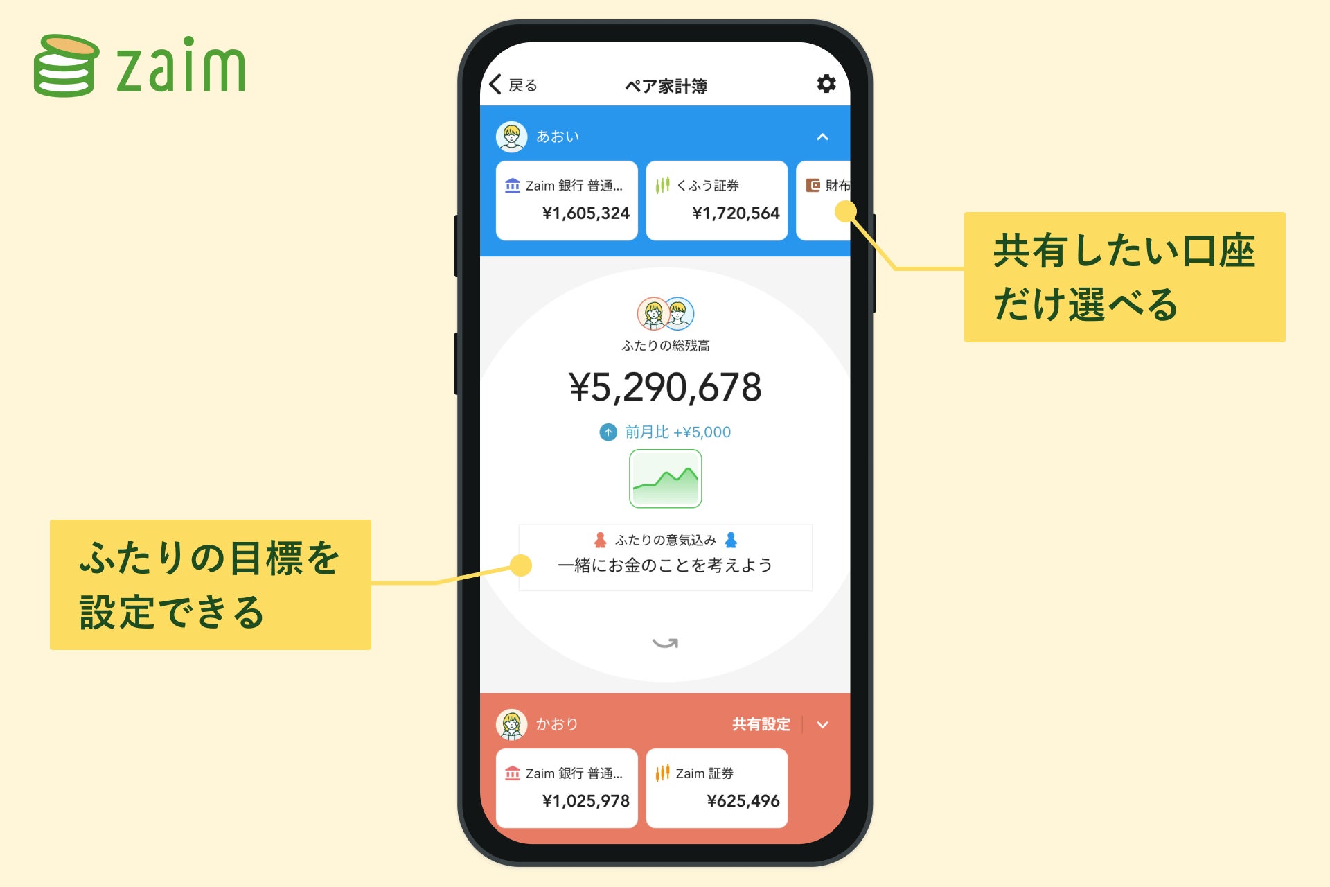 パートナーと一緒にお金の管理を行う第一歩として、「Zaim」では、銀行や証券会社の口座残高や推移を共有できる新機能「ペア家計簿」を追加しました。