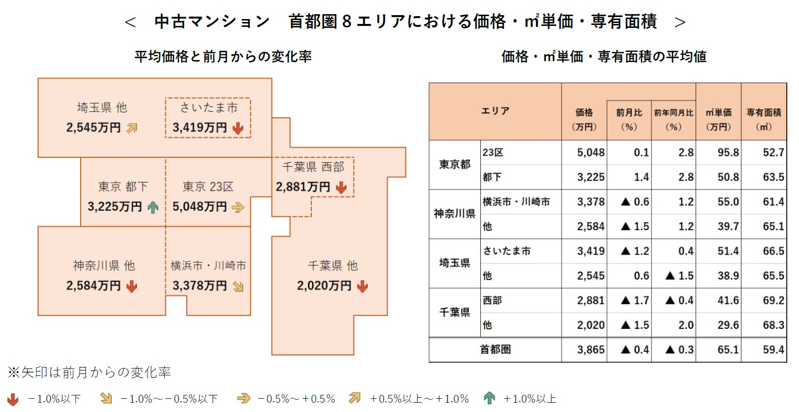 首都圏の中古マンション1戸あたり平均価格は3,865万円。前月比は-0.4%と2カ月ぶり、前年同月比は-0.3%と42カ月ぶりに下落。