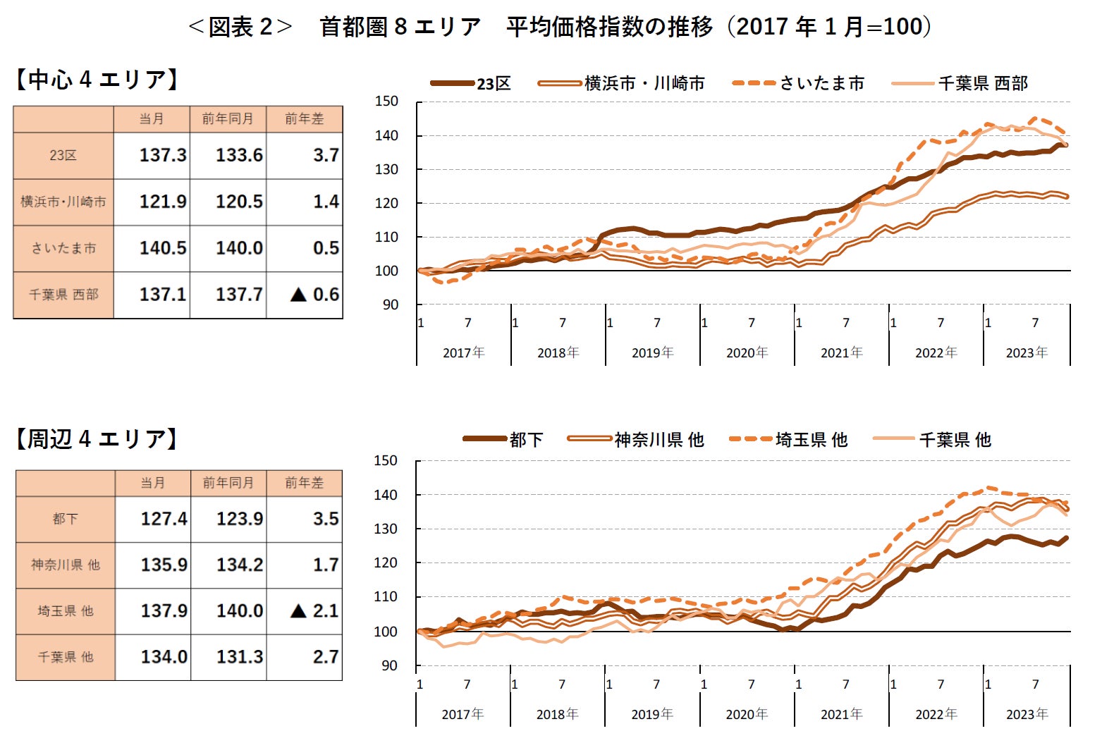 一方、東京23区は6カ月連続で上昇しており、2017年1月以降最高額を4カ月連続で更新した。2カ月以上連続で上昇したのは同エリアのみ。