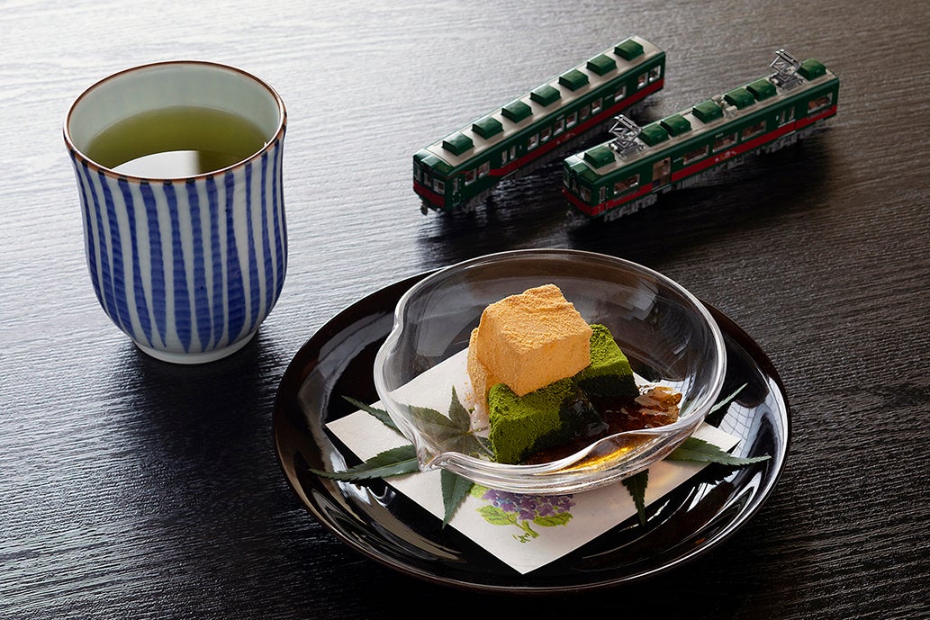 和歌山の漁港で水揚げされたしっとりモチっとした食感が特徴のマグロはお造りに。泉州産の旬の野菜は天婦羅にして、岸和田市「鯨屋」の羊水塩が素材そのものの美味しさを引き立てます。えぐみが少なく優しい味わいの泉州産法蓮草は、ゴマ浸しであっさりとお召し上がりください。和歌山産のふんわりとした釜揚げしらすは素材の味を活かし、自家製ポン酢と大根おろしでシンプルに。その他、米の風味が豊かな泉州米の菜飯や、創業明治30年の老舗、黒門市場「伊勢谷」のお漬物など、南海電鉄沿線の旬の食材が詰め込まれたメニューに仕上がりました。オプションのデザートには、抹茶ときな粉のわらび餅 黒蜜ゼリーと堺市「つぼ市茶寮」の緑茶をセットに。食後のひとときをお過ごしください。