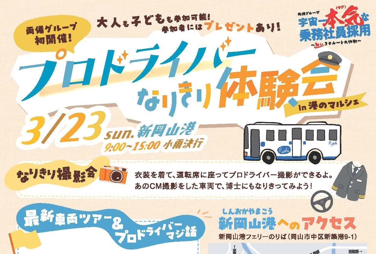両備グループ(岡山県)のトランスポーテーション&トラベル部門<両備グループの交通運輸に携わる事業会社の総称>は、「宇宙一本気(マジ)な乗務社員採用プロジェクト」を通じて、次の100年につながる安定的な総合運輸交通サービスの基盤づくりを目指しています。2024年11月よりシーズン2として、ネクスト100年を創る運行能力確保に取り組んでいますが、2025年3月23日(日)新岡山港フェリーのりばで「プロドライバーなりきり体験会 in 港のマルシェ」を開催する運びとなりました。