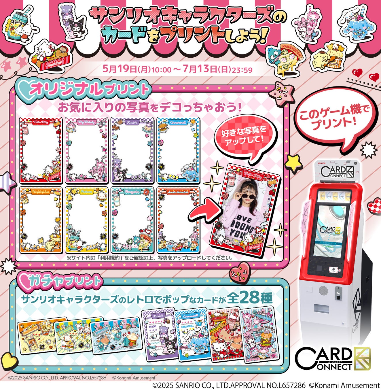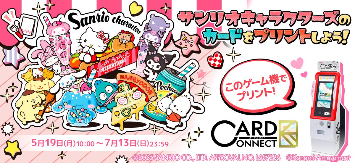 株式会社コナミアミューズメントは、アミューズメント施設向けカードプリントゲーム機『カードコネクト』にて、株式会社サンリオのキャラクターたちとのコラボデザインイベントを2025年5月19日(月)から7月13日(日)まで開催することをお知らせします。