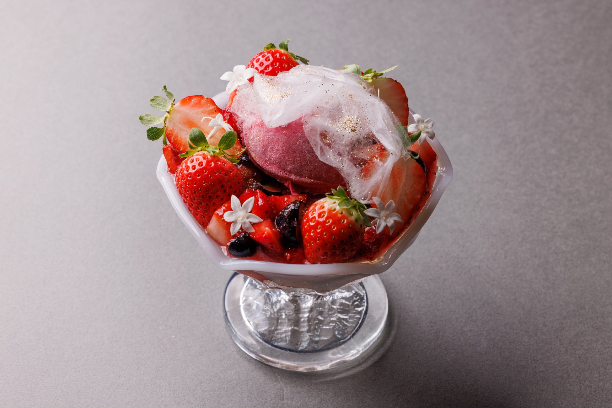 春を代表する和菓子「苺大福」をイメージした華やかなパフェには、濃厚な甘味と程よい酸味のバランスが取れた 「とちおとめ」を使用。パフェグラスの底にバター香るクランブルを敷き詰め、その上に大納言小豆と柔らかな求肥ロールをのせ、ラズベリーとブルーベリーの濃厚なソースを流し込みました。トップ部分にはたっぷりのフレッシュ苺とブルーベリーを飾り、仕上げに濃厚なベリオレットのソルベをトッピング。繊細な綿飴のレースでおめかしをした、果汁感あふれるこの季節限定のパフェをご堪能ください。