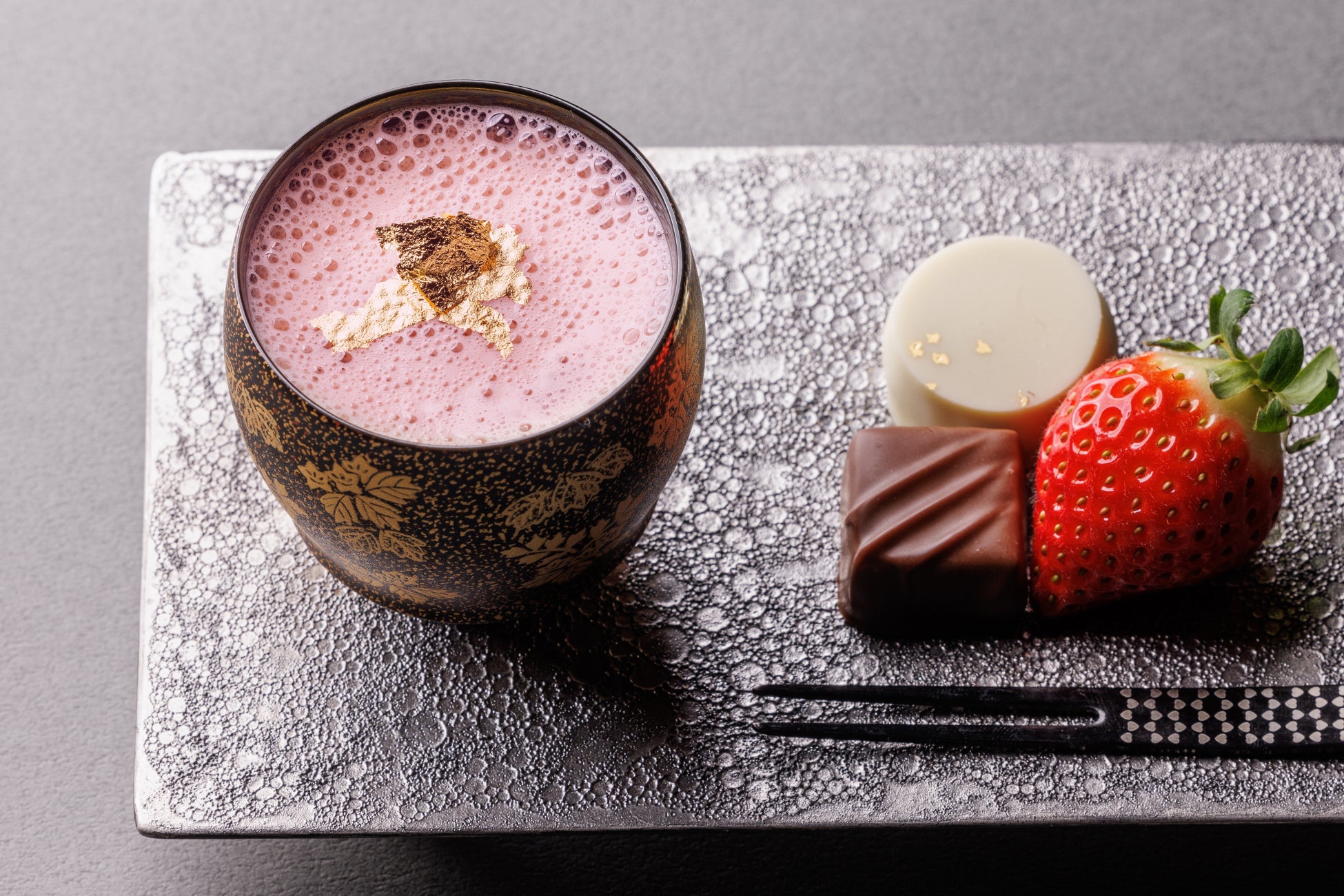 「ザ バー」では、甘い苺ピューレとミルキーなホワイトチョコレートにきな粉を合わせた和テイストのデザートカクテル「フレーズショコラ」をご提供いたします。苺の果肉感とホワイトチョコレートの口溶けに、 隠し味としてきな粉のコクを加えることで、複雑味のあるテイストに仕上げました。水盤に面した幻想的な空間で、濃厚な口当たりのオリジナルカクテルとともに優雅なひとときをお過ごしいただけます。 鷹峯三山の麓の豊かな自然に囲まれたROKU KYOTOにて、旬を迎える苺を堪能するパフェやカクテルをお楽しみください。