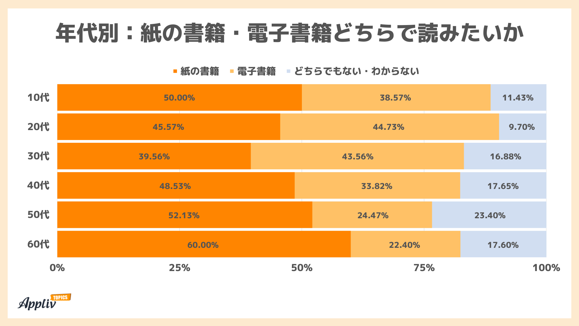 年代別で回答の内訳を見ると、30代以外は「紙の書籍」が「電子書籍」を上回っています。特に60代が最も大きく、60.00%が「紙の書籍」の方が良いと回答しました。