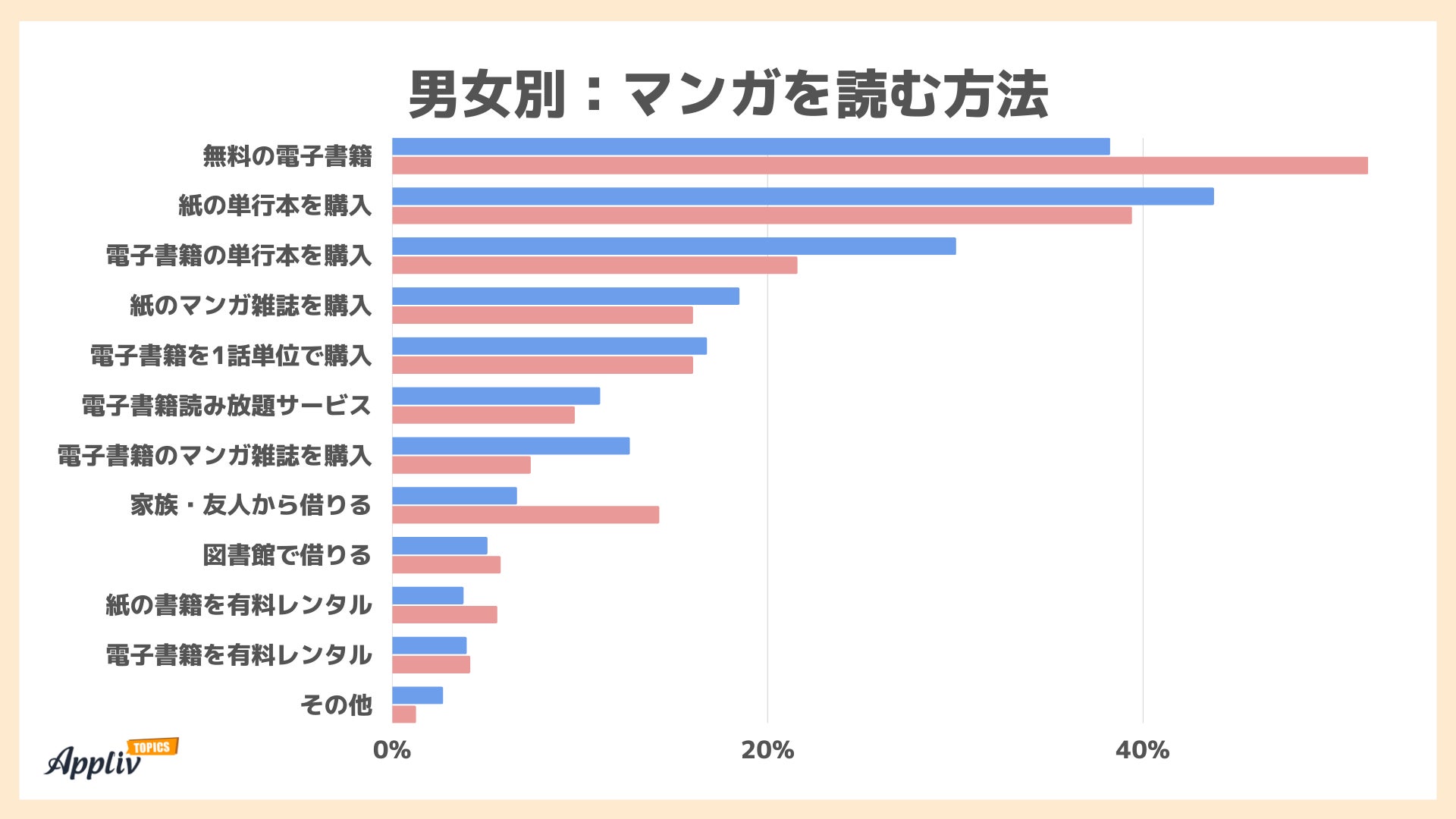 マンガを読む方法は、女性が「無料の電子書籍」、男性が「紙の単行本を購入」が最多。