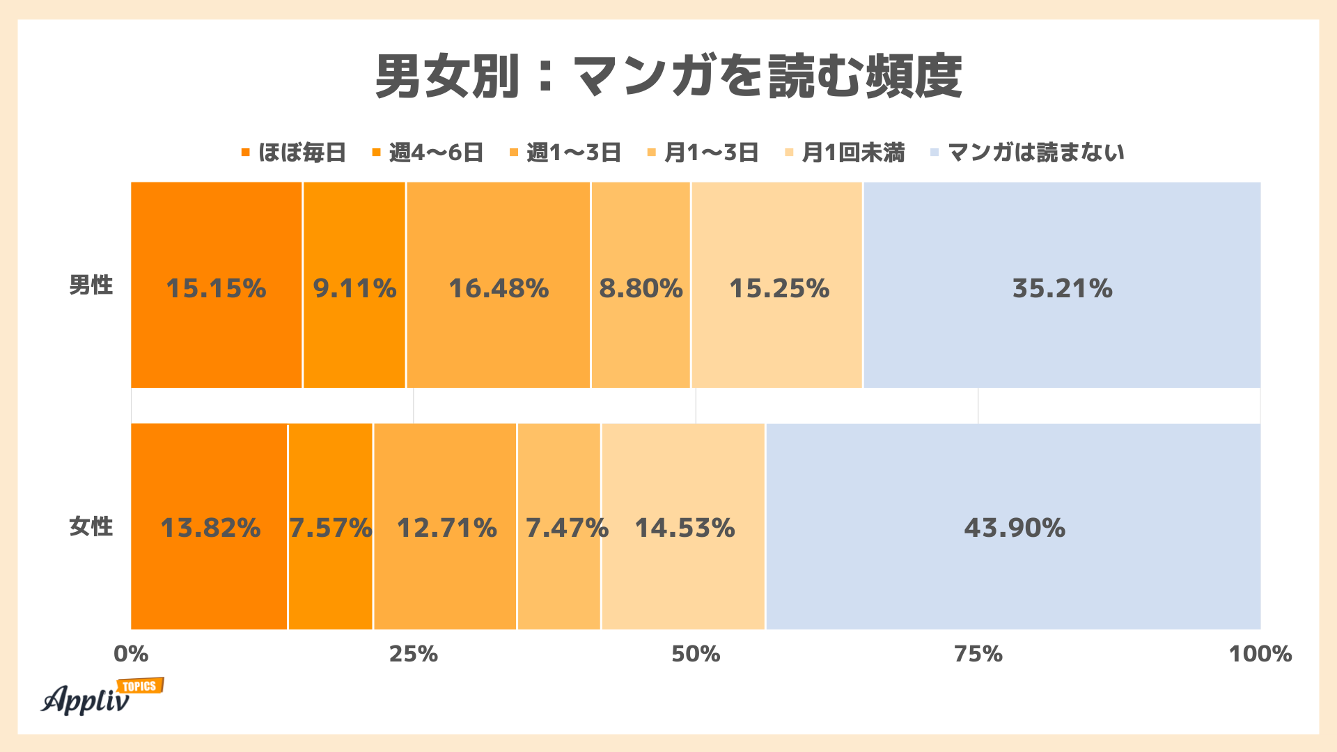 男女別でマンガを読む頻度の回答内訳を見ると、「マンガは読まない」は女性の方が多いです。