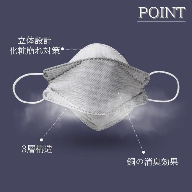 そんな魅力を秘めた抗菌力のある銅繊維を用い、口紅などを塗る女性にも優しい人体工学的な3D設計の立体型マスクです。