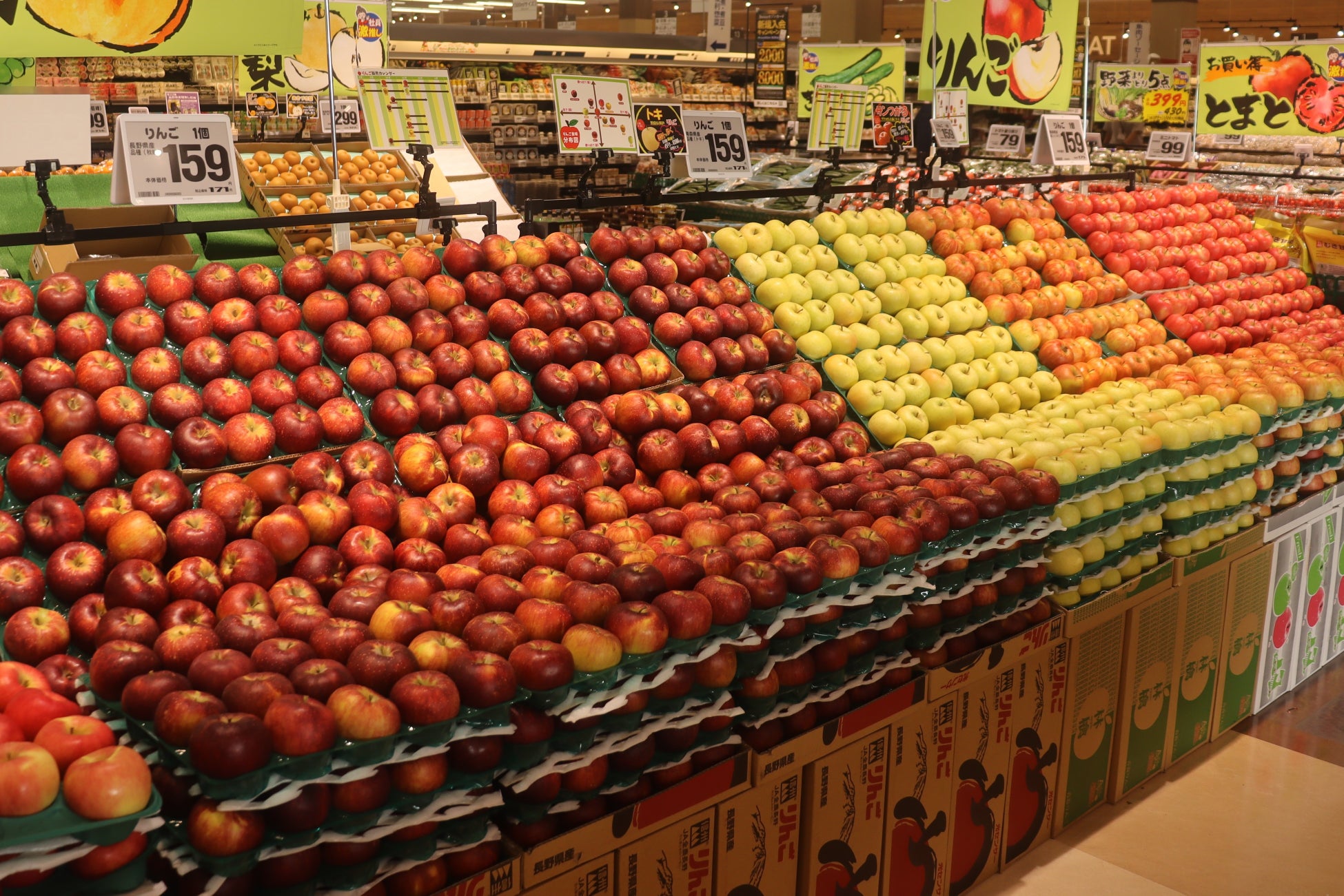 青果コーナーでは、旬の果物が鮮度感を演出しながら皆様をお迎えします。また野菜はハーフカットなどを増やし、選びやすく使い切りやすいサイズ感で提供いたします。鮮魚コーナーでは、近隣の漁港から水揚げされた鮮度抜群の丸魚を取り揃えるほか、名産のあじ・くじらを活用した商材を豊富に展開します。