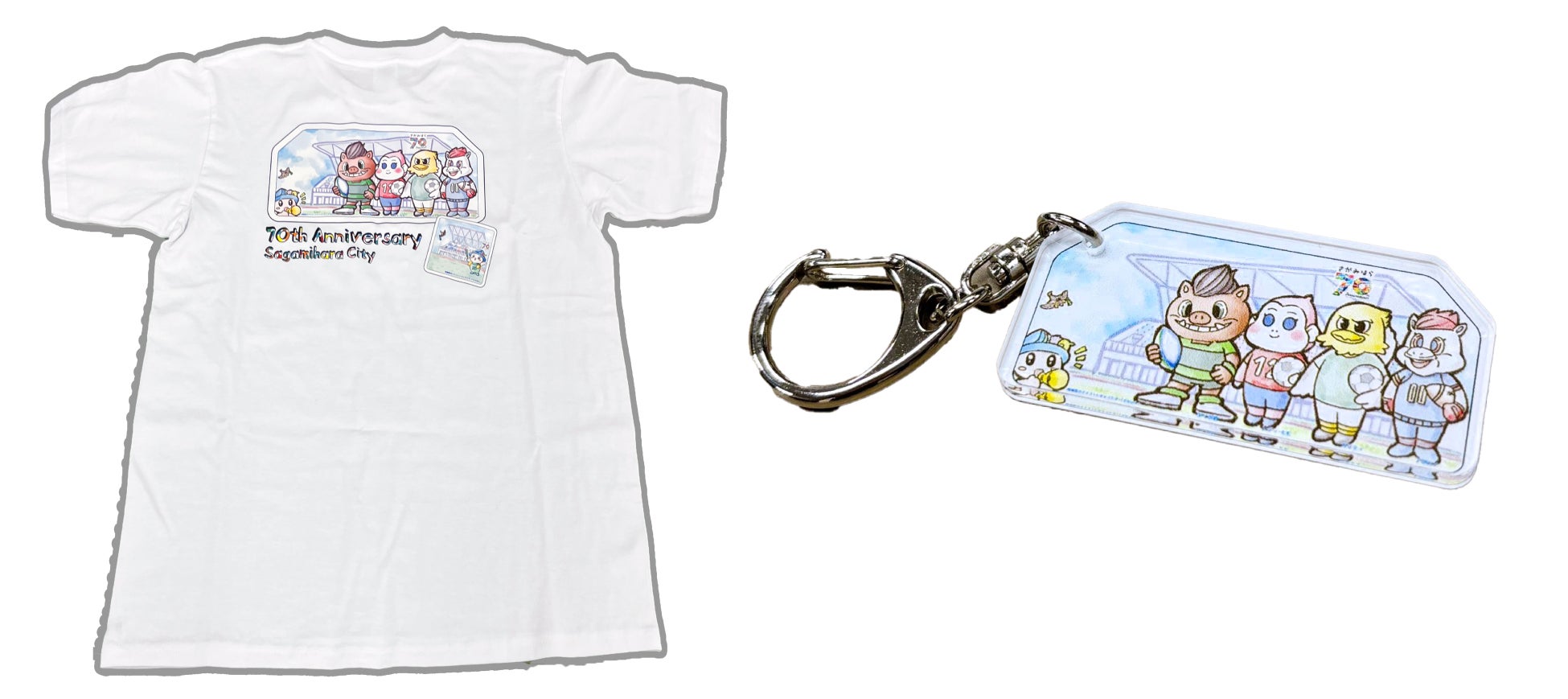 公式X「相模原市シティプロモーション」をフォローの上、「#相模原推し」を付けて投稿した方の中から抽選で5名に、鎧田氏描き下ろしオリジナルナンバープレートのデザインTシャツとキーホルダー、イラストシート(複製)をセットにしてプレゼントします。