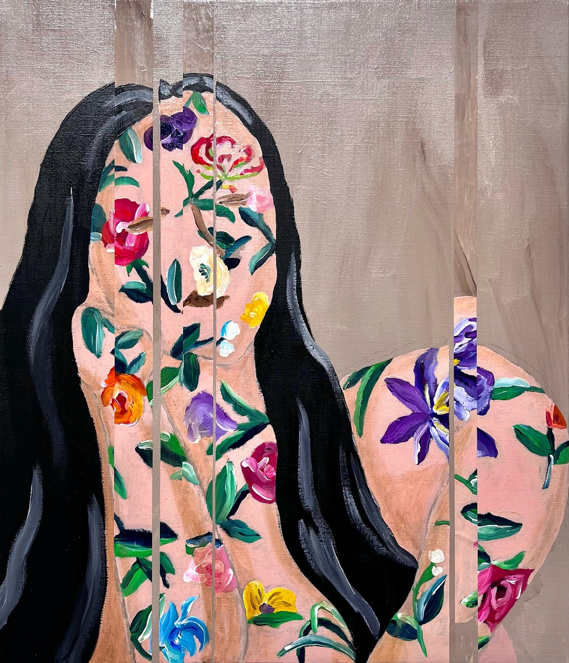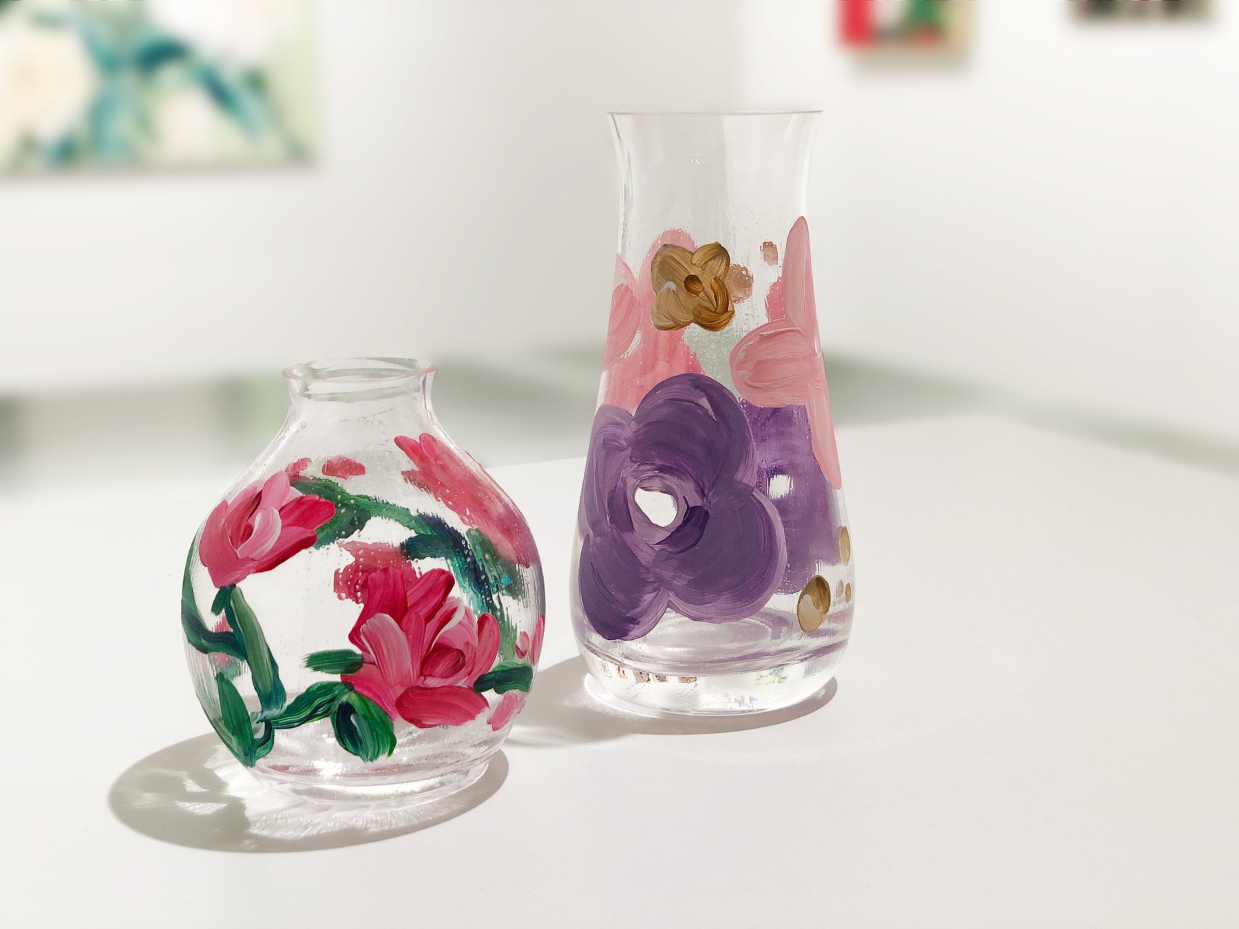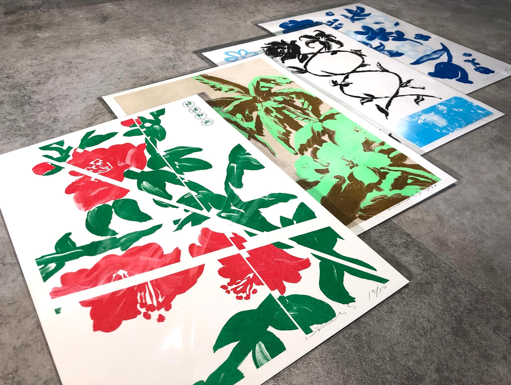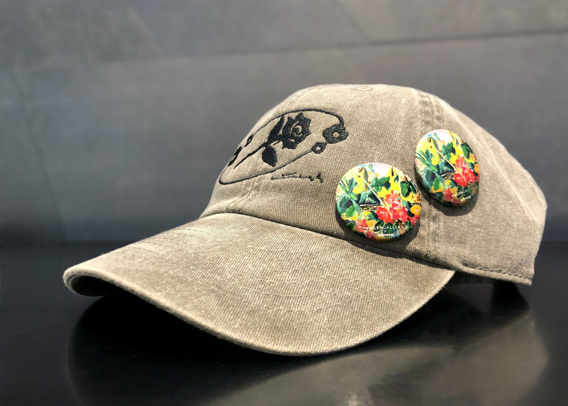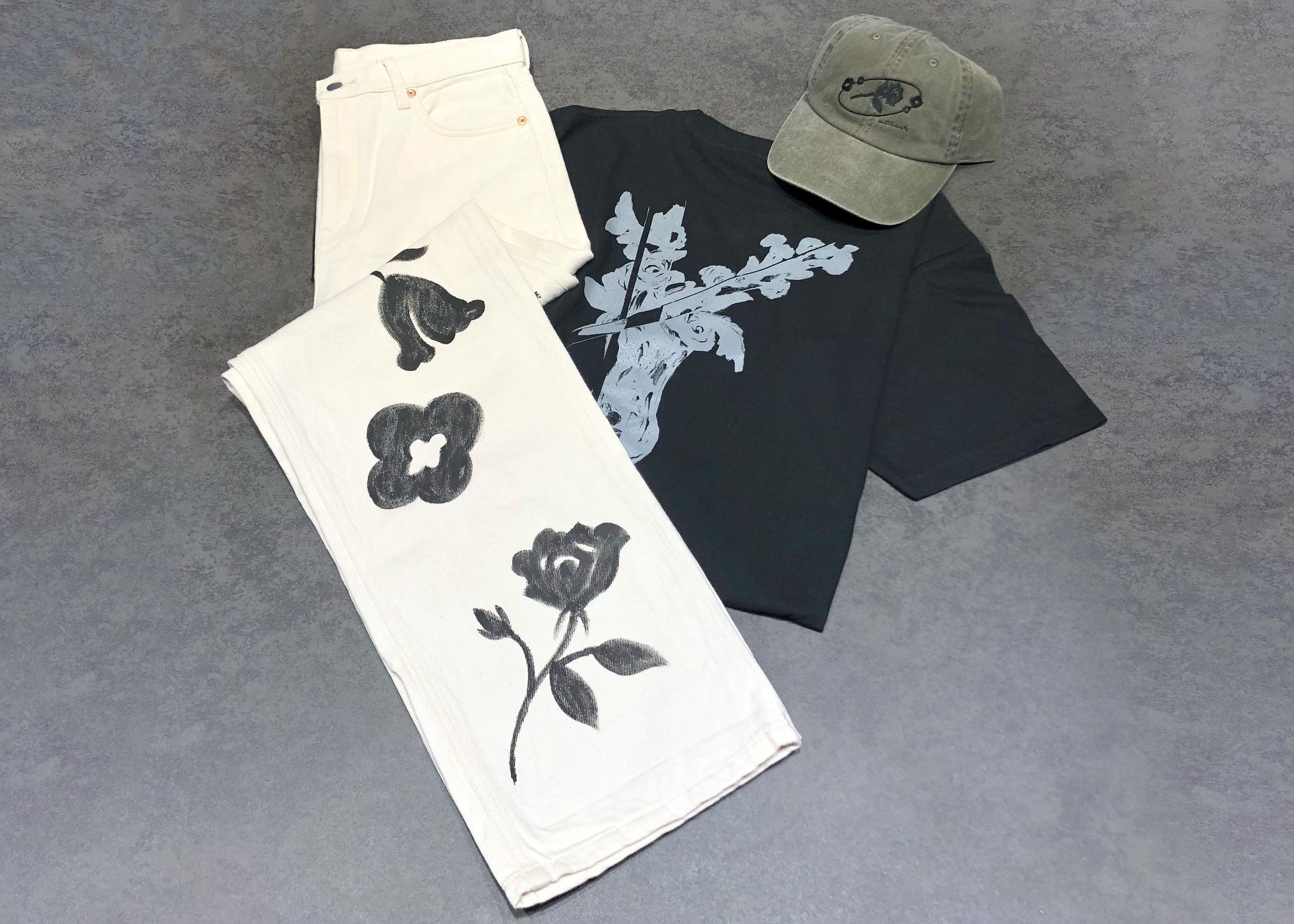 本展オリジナルデザインの新作Tシャツは、バッグに大きく描かれた花が印象的な一枚。また、作家自身が一着ずつ手書きでデザインを施した古着パンツや、繊細な花をモチーフにしながらもストリート感あふれるニュアンスを含んだキャップなど、多彩なアパレル商品を取り揃えました。