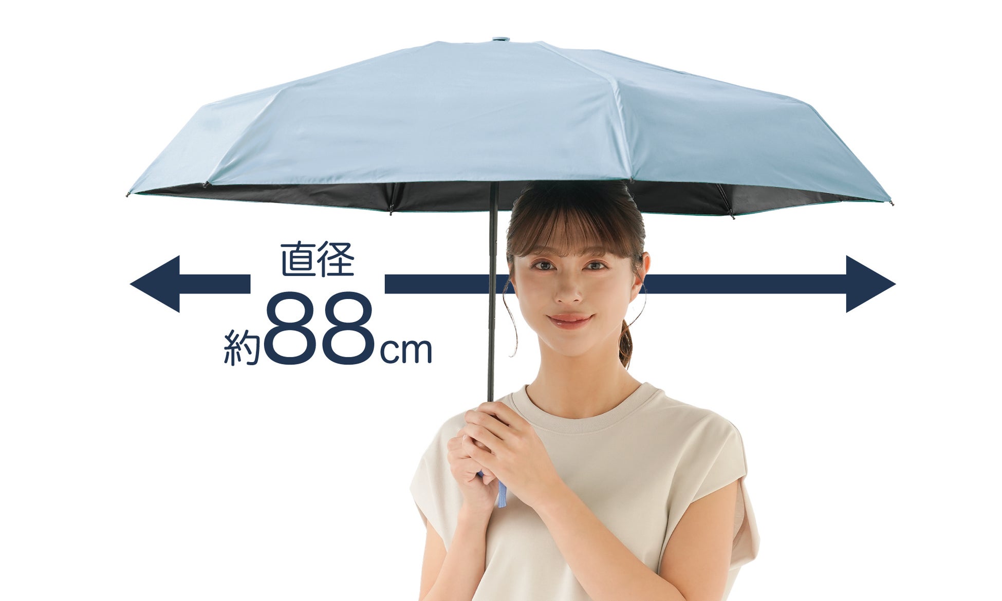 直径約88㎝。収納時わずか17.5cmの超コンパクトサイズなのに、広げればで肩まですっぽりガードできます。半袖やノースリーブでも体全体を日差しから守ってくれます。