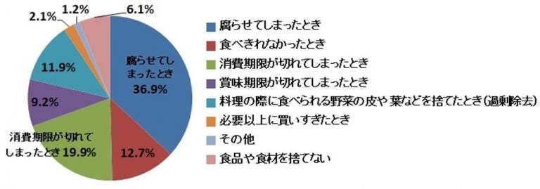 捨てるのは「腐らせてしまったとき」が最も多くて、66.4%と回答数の3分の2を占めました。「消費期限が切れてしまったとき」「賞味期限が切れてしまったとき」「食べきれなかったとき」などが、これに続きました。