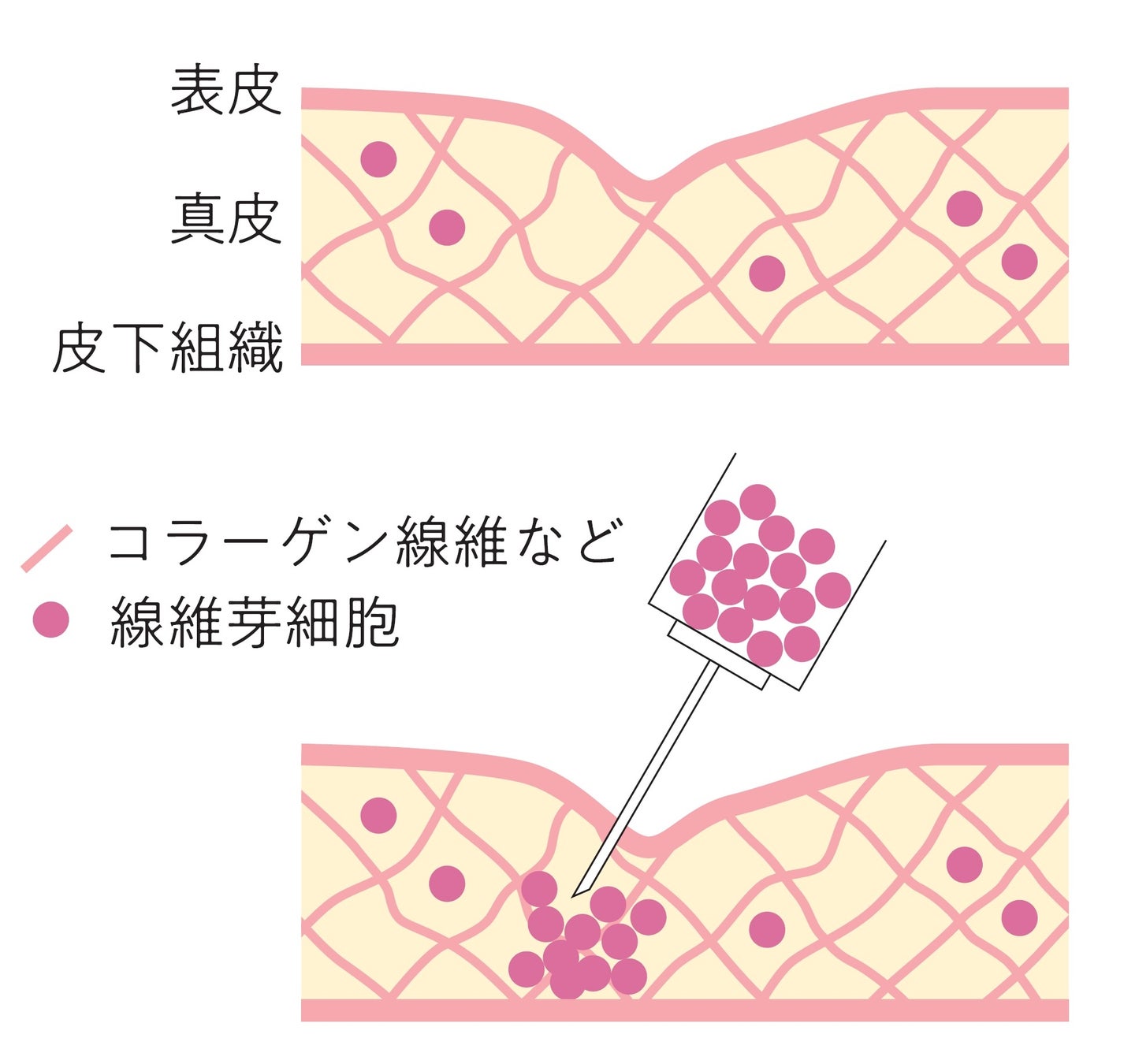 本書でご紹介している再生医療のひとつ、「線維芽細胞治療」では、自身の線維芽細胞を取り出して培養し、約1億個増やして肌に注入します。線維芽細胞とは、肌のハリや潤いのもととなるヒアルロン酸などの成分をつくり出す「生産工場」のような役割。つまり、この治療では、潤いの生産工場そのものを増やすことで、細胞自らが肌のなかでハリや潤いを生み出すようになるのです。