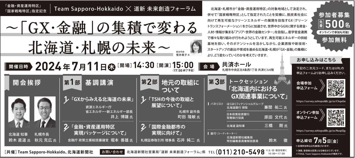 「金融・資産運用特区」「国家戦略特区」指定記念 Team Sapporo-Hokkaido×道新未来創造フォーラム を開催します!