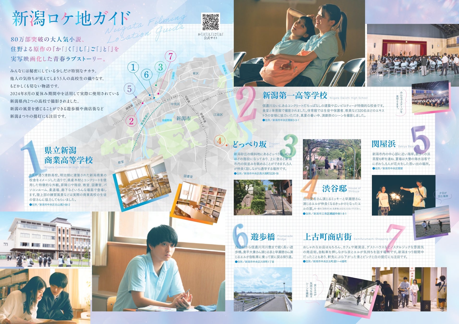 今回、映画の公開を記念して、撮影スポットを紹介する『新潟ロケ地ガイド』が完成しました。 県立新潟商業高校や新潟第一高校をはじめ、地元の人々に親しまれる商店街や遊歩道、さらには新潟まつりの提灯が映り込むシーンなど、新潟らしい景色がふんだんに登場します。