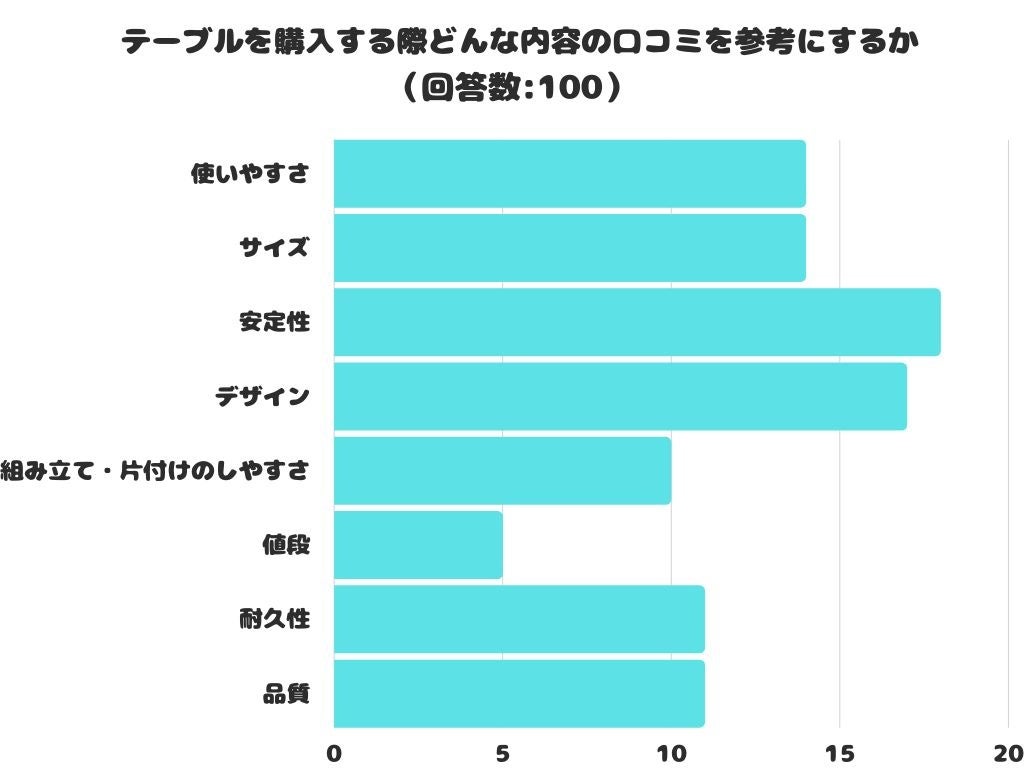 テーブルのどんな内容の口コミを参考にするかをアンケートにて調査したところ、1位は「安定性」 でした。
