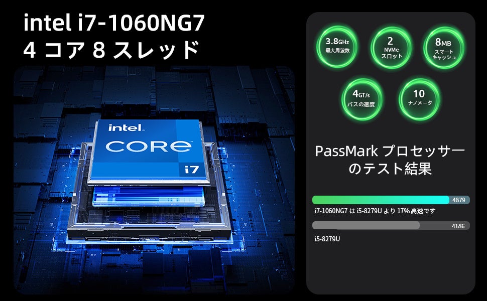 BMAX B6 Power は、第 10 世代 Intel Core i7-1060NG7 プロセッサー、16GB LPDDR4 /2133MHz メモリー、1TB NVME SSD を組み合わせており、起動時間とアプリケーション起動の高速化を実現します。 ダウンロード、映画の視聴、ビデオ編集、デザインなどの難しいが効率的なタスクに適しています。 4コアと8スレッド、8MBキャッシュ、10nmの先進テクノロジー、NVMeデュアルチャネルは拡張メモリをサポートします。 16GB+1TBメモリを完全に拡張できます。 M.2 NVMe SSD スロット ✖2.