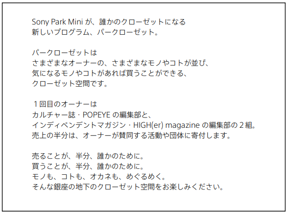 様々なモノやコトを買える、誰かのクローゼット空間『パークローゼット』- POPEYE / HIGH(er) magazine - 6月20日(火)まで、Sony Park Miniにて開催中