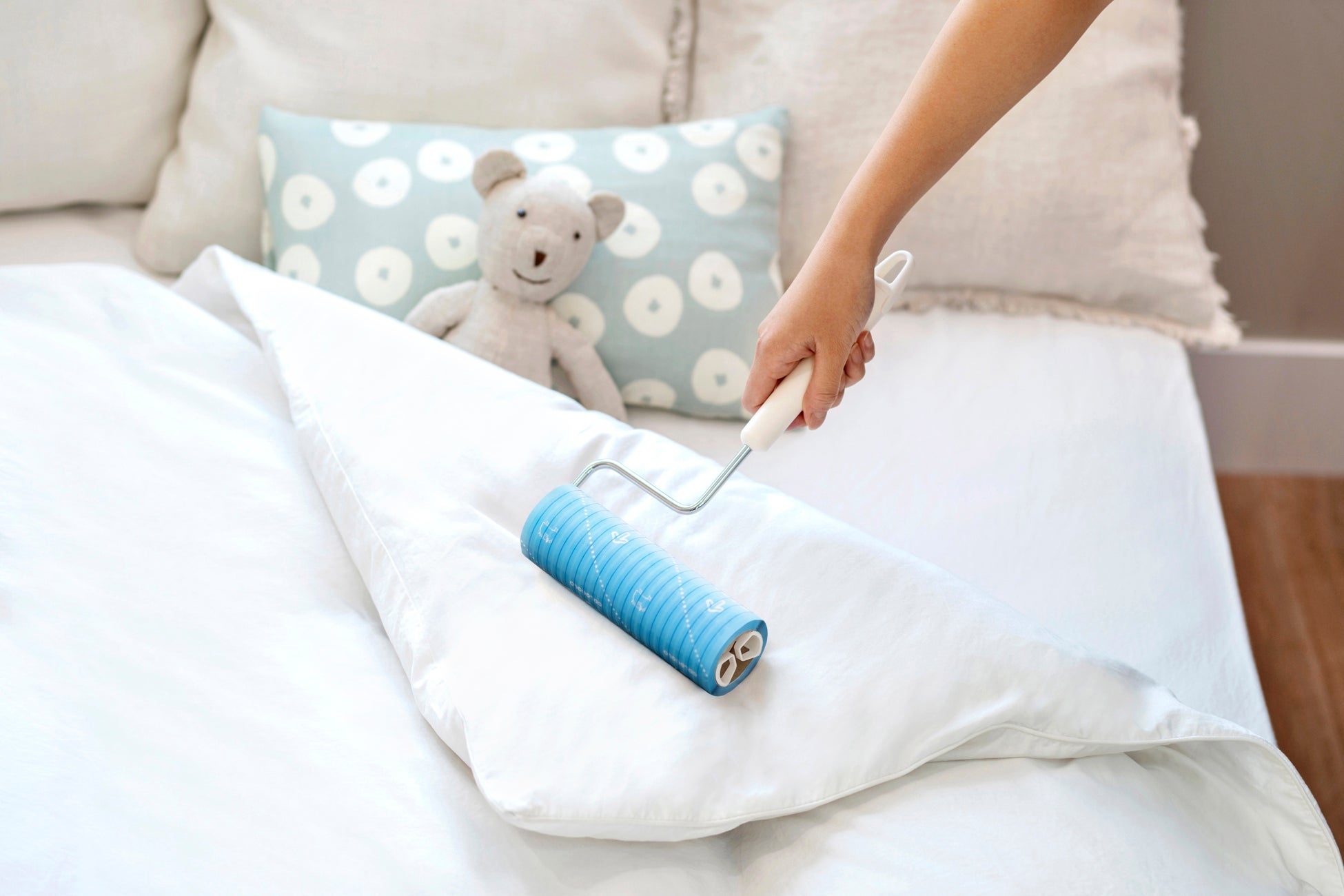 ベッドメイキング時に寝具上で『コロコロ ダニクリーナー』を転がすだけで、髪の毛やフケなどのゴミはもちろん、生きたダニ・ダニの死骸・フンも除去することができ、手軽に快適な睡眠環境を整えることができます。また、殺虫・忌避剤成分を使用していないため、小さなお子様やペットのいる家庭でも安心して使用することができます。