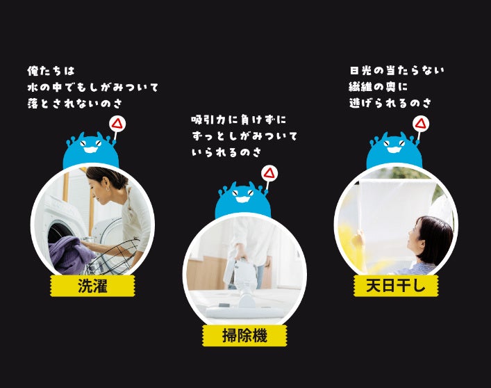 一般的なダニ対策の方法として、寝具やファブリック類の洗濯・掃除機がけ・天日干しなどが挙げられ、これらはダニの死骸やフンの除去には効果があります。しかし、生きたダニは洗濯中も水の中で生き残ったり、掃除機の吸引に負けずにしがみついていたり、天日干しされても日光の当たらない寝具の奥に逃げたりするため、これらの方法では取り除ききれない恐れがあります。