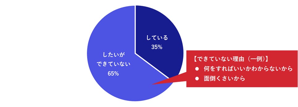 アンケートの結果から、身の回りのダニを気にしていながら、具体的なダニ対策に取り組めていない方が全体の65%を占めていることがわかりました。その理由としては「何をすればいいかわからないから」や「面倒くさいから」が挙がりました。
