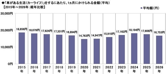 ◆カーライフのためにかけられる金額 平均16,753円/月、昨年調査から853円減少
