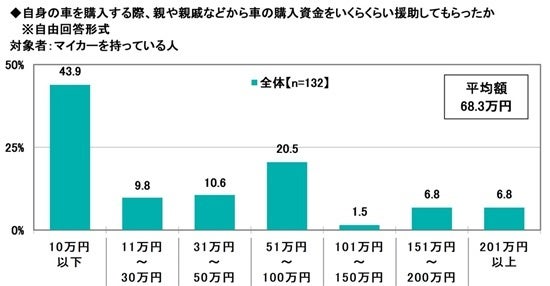 マイカーを持っている方132名に、自身の車を購入する際、親や親戚などから車の購入資金をいくらくらい援助してもらったかを聞いたところ、「10万円以下」(43.9%)との回答が特に多くなったほか、「51万円~100万円」(20.5%)にも回答がみられ、平均額は68.3万円でした。
