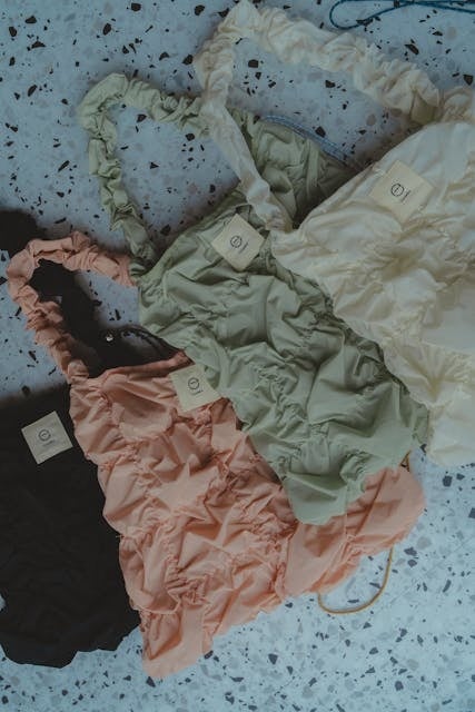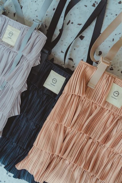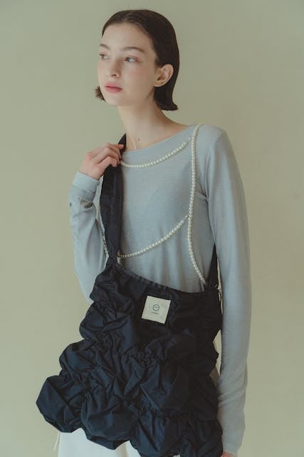 プリーツ状のフリルデザインが女性らしいトートバッグ。