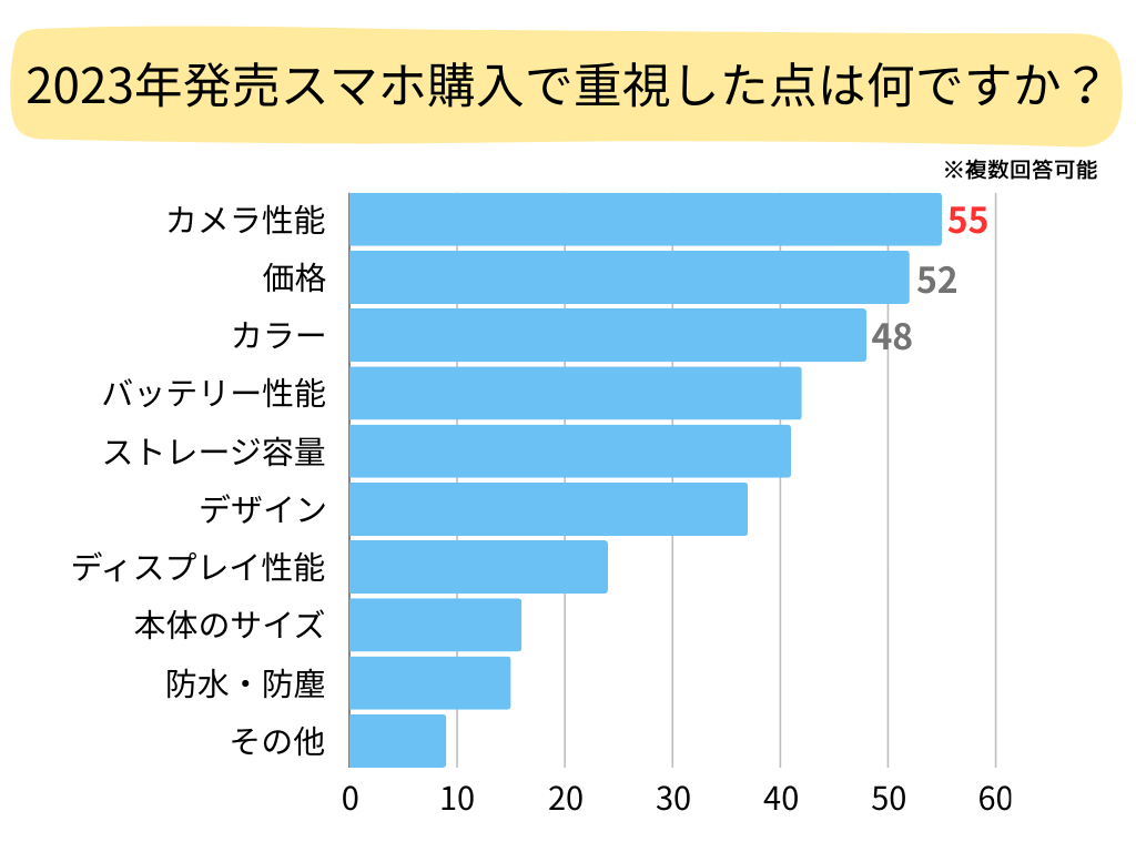 次に、「購入の際に重視したことを教えてください」と聞いたところ、一番票が多かったのは「カメラ性能」で55票、次いで「価格」が52票でした。