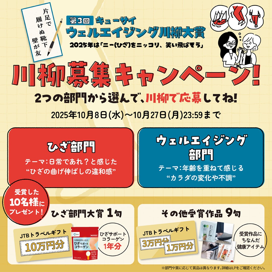 キューサイ株式会社(本社:福岡市中央区、代表取締役社長:石川 順朗)は、毎年2000件以上に上る応募で大変好評いただいている『キューサイウェルエイジング川柳大賞』の第3回を10月8日(水)より開始いたします。2025年は『ニー(ひざ)ニッコリ』にかけて【ひざ部門】を新設し、ご自身が年齢を重ねることで感じる「カラダの変化や不調にまつわるあるある」などの作品を募集いたします。