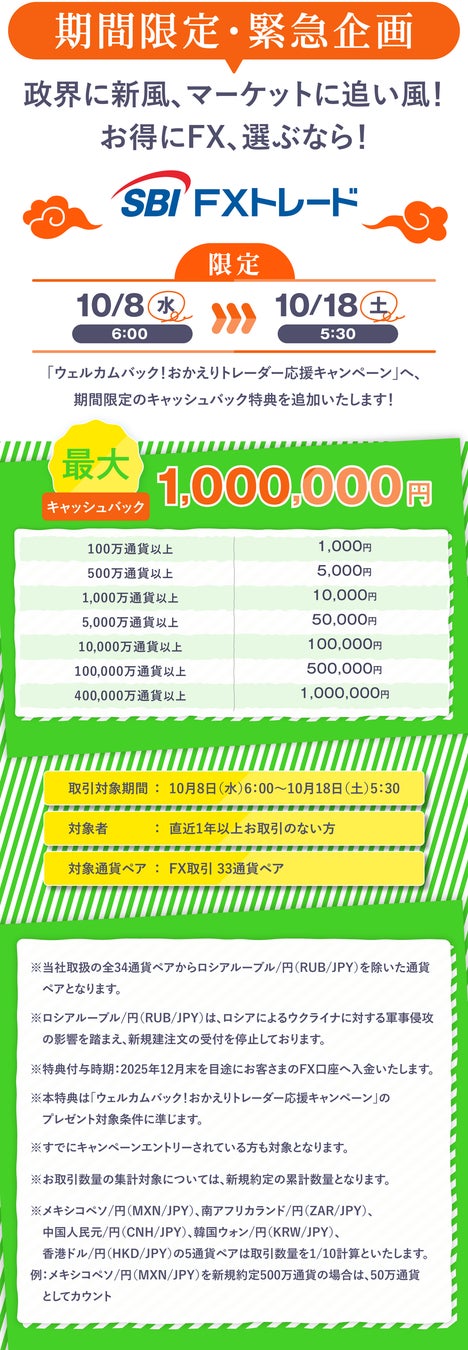 SBIホールディングス株式会社(本社:東京都港区、代表取締役会長兼社長:北尾 吉孝)の連結子会社で、個人投資家向けに外国為替取引サービスを提供するSBI FXトレード株式会社(本社:東京都港区、代表取締役社長:藤田 行生、以下「当社」)は、現在実施中の「ウェルカムバック!おかえりトレーダー応援キャンペーン」において、対象となるお客さま全員に向けて、期間限定の特別キャッシュバック企画を追加いたしました。
