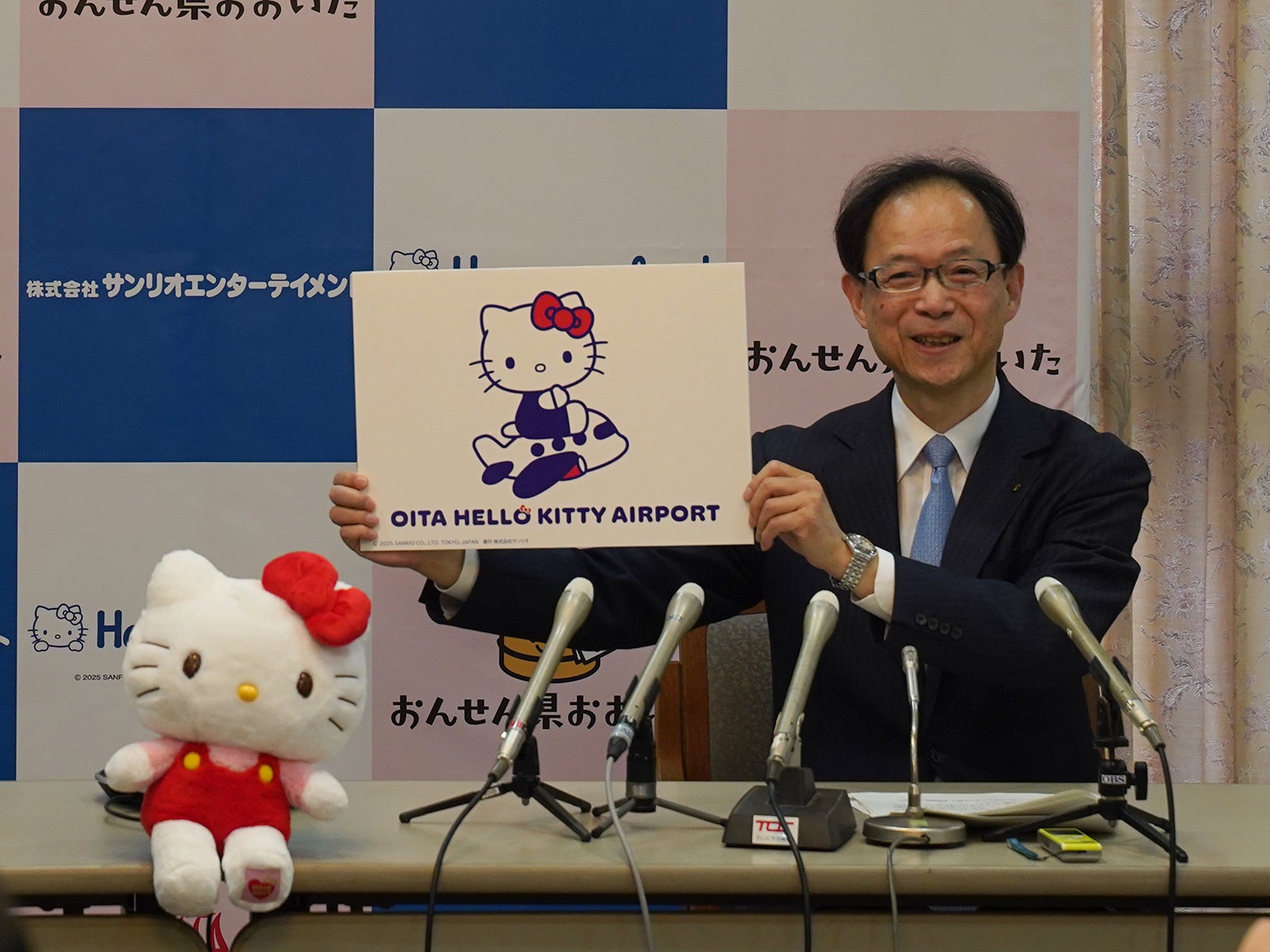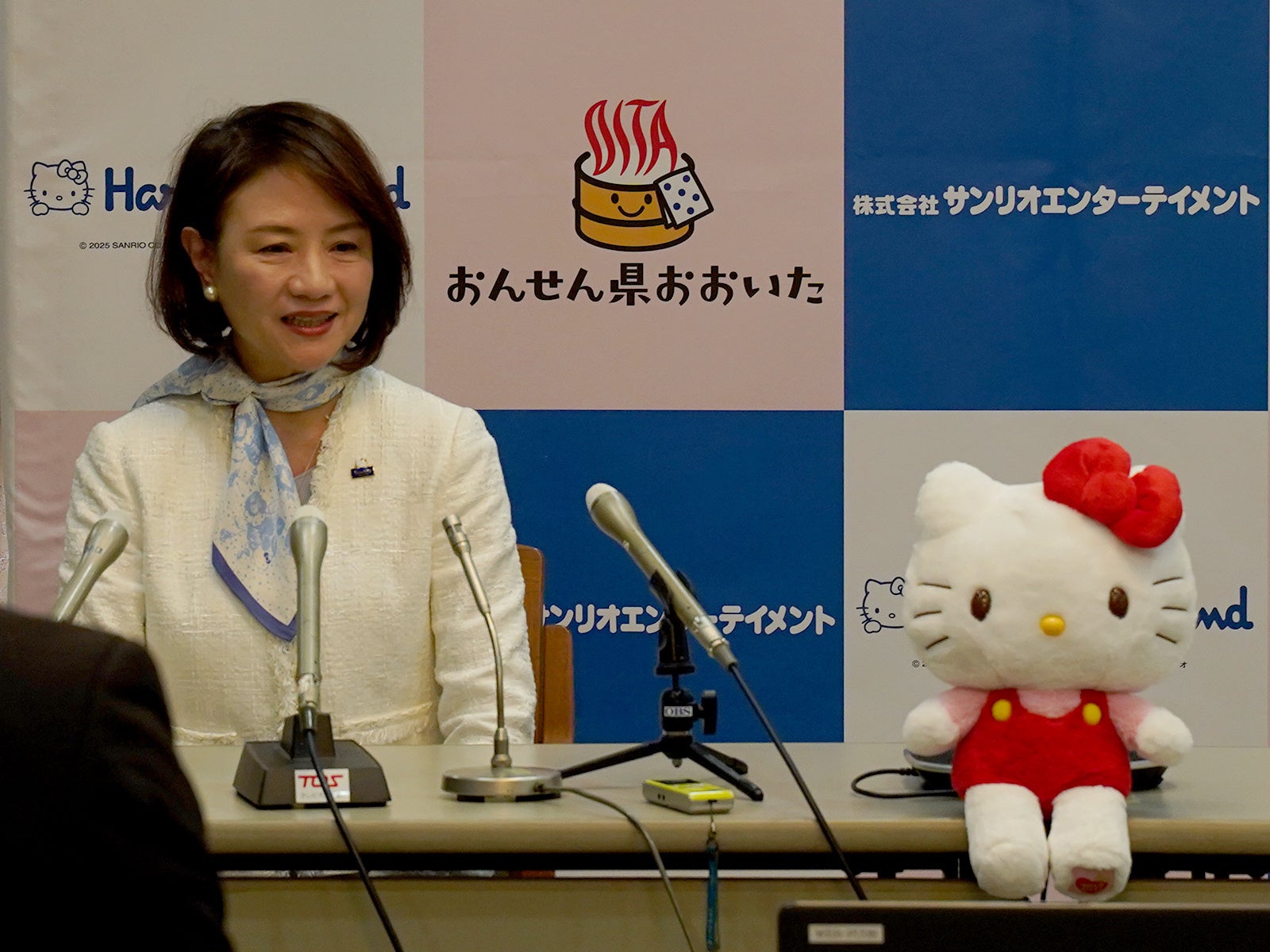 大分県庁舎本館4階貴賓室で行われた共同記者発表では、大分県知事の佐藤樹一郎氏、株式会社サンリオエンターテイメント代表取締役社長の小巻亜矢が出席し、観光キャンペーンの概要や、「大分ハローキティ空港」のロゴ発表などを行いました。また、ハローキティも特別ゲストとして参加し、出席者との記念撮影が行われました。