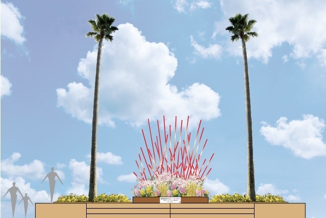 約100本の赤に着色した角材を、上空へ放射状に伸ばしダイナミックに組み上げ、“春の花”をふんだんにいけます。人が生きていくために必要なものと結び付きの強い「赤」の色は、エネルギーを感じさせるアクティブで元気を与えてくれる色です。アニバーサリーのお祝いと共に、ご来場されるすべての皆さまに、希望と元気をお届けしたいという想いでこの作品を制作します。