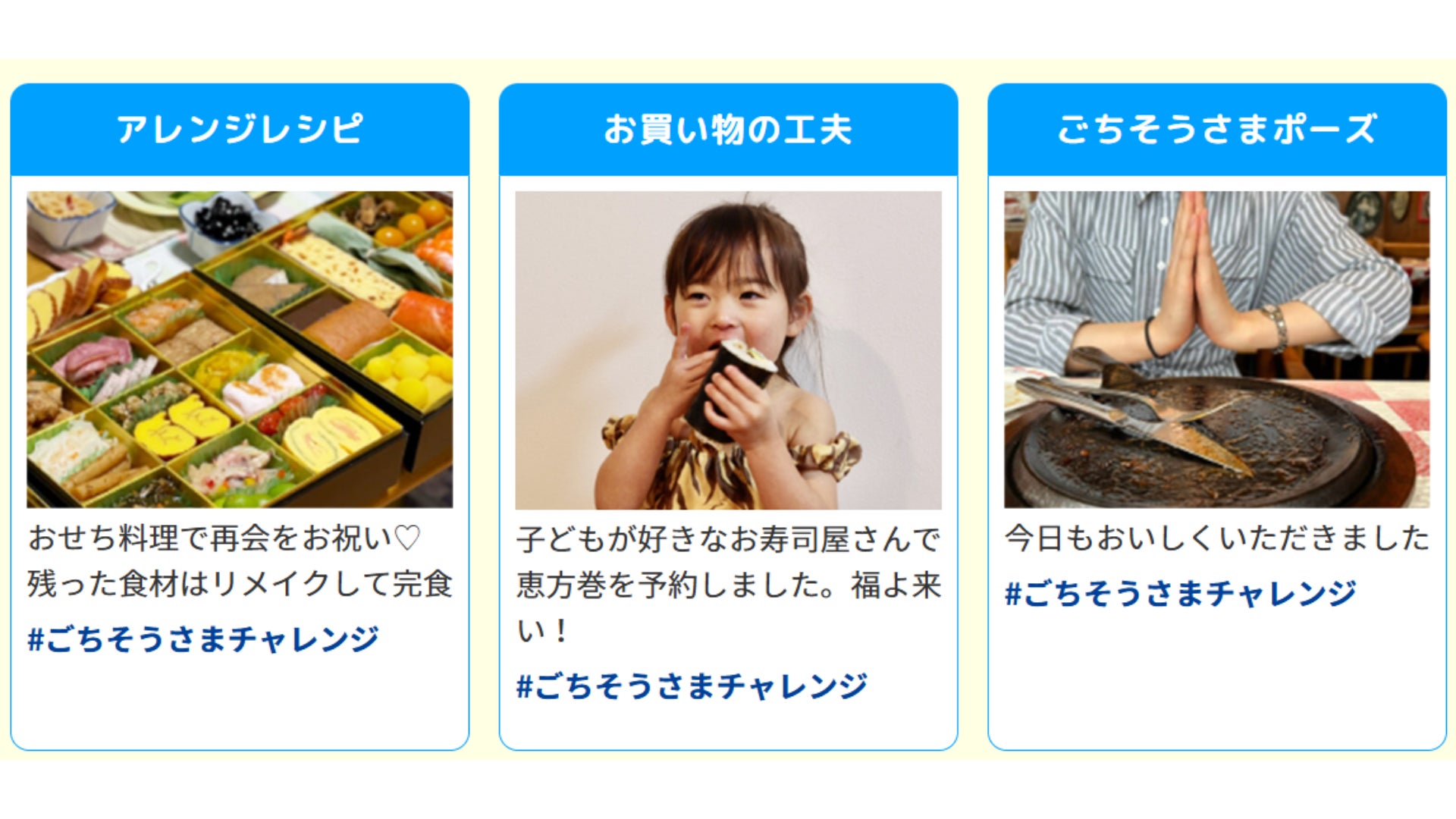 「#ごちそうさまチャレンジ」は、こうした「食品ロス」と「飢餓」という2つの食料問題への関心を促し、さらに食品ロス削減の取り組みを通じて「寄付」ができるSNSキャンペーンです。本年は、食品ロスに関して注目が集まるクリスマス、年末年始、節分、バレンタインデーを含む期間で実施。身近にできることから食品ロス削減に取り組み、途上国の子どもたちへの学校給食支援の輪を広げることを目指します。