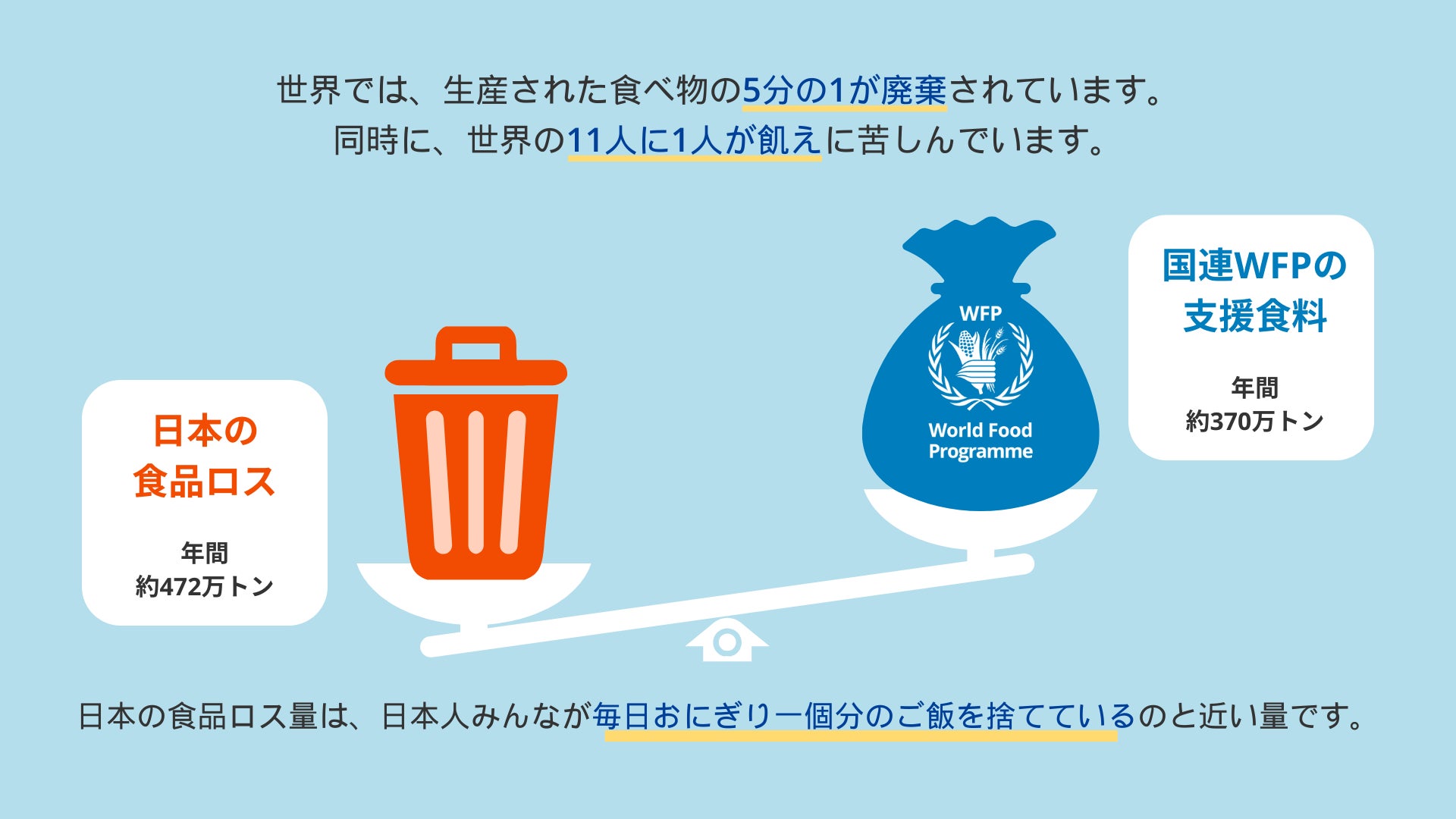 国連5機関が7月に発表した「世界の食料安全保障と栄養の現状(SOFI)」報告書によると、2023年に飢餓に直面した人は、最大7億5700万人(世界人口の11人に1人)。依然として憂慮すべき数の人々が、食料不安と栄養不良に直面しています。一方で、世界では食料生産量の5分の1が捨てられており、日本でも年に約472万トン(2022年)が食品ロスとなっています。日本人1人当たりが毎日おにぎり一個分のご飯を捨てているのと近い量で、国連WFPの2023年の食料支援量370万トンより多い量です。