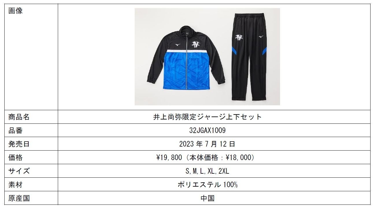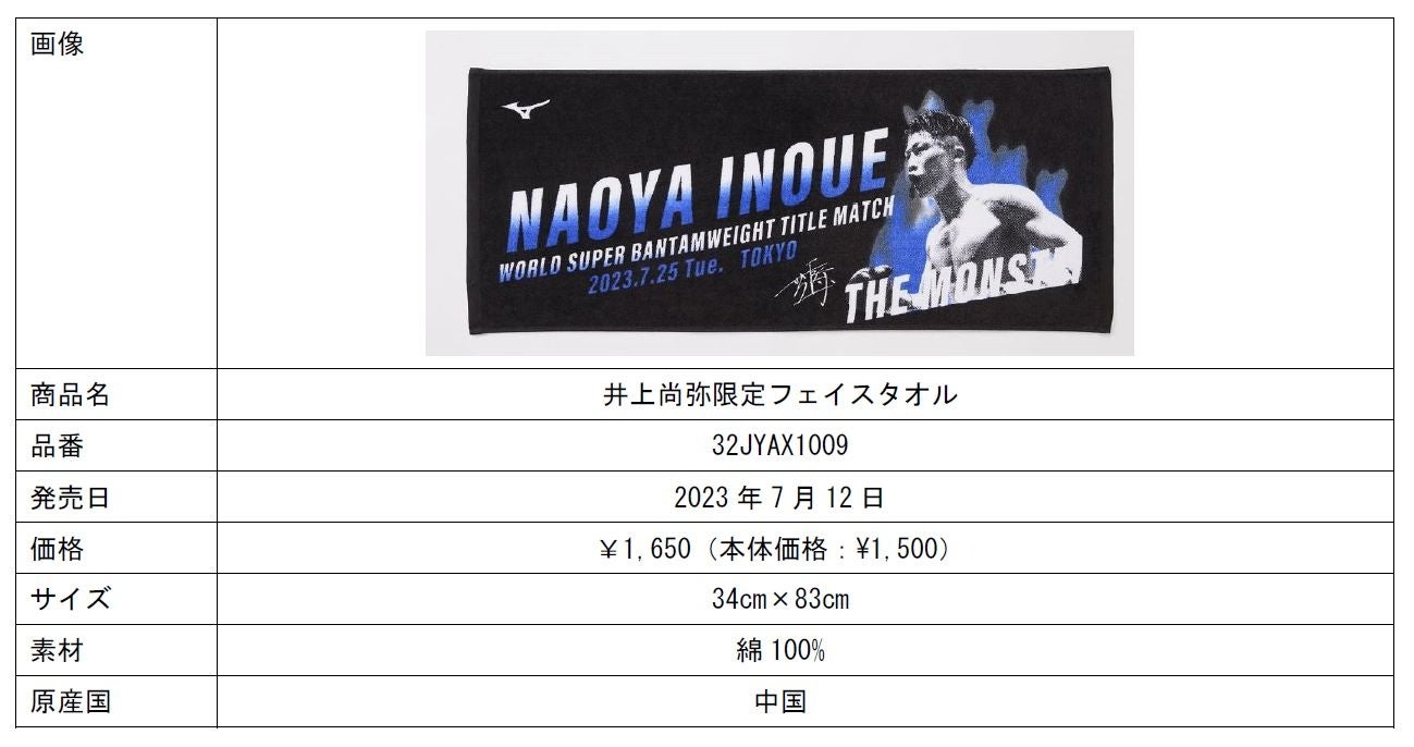 ミズノは、7月25日(火)に行われるスーパーバンタム級転向後初のタイトル戦に挑む井上尚弥選手の応援企画として、オリジナルTシャツ、フェイスタオル、井上尚弥選手と、大橋ジムスタッフが着用するジャージと同じデザインのジャージ上下セットをミズノ公式オンライン、MIZUNO TOKYOで7月12日(水)に発売します。