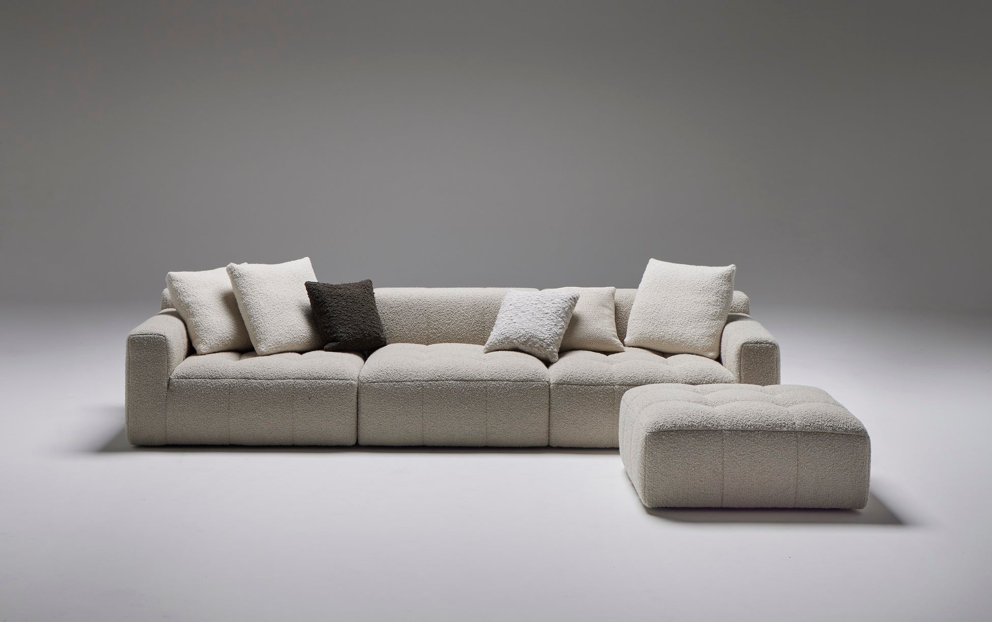 充実した設備と確かな技術力を誇る自社工場で、名だたる一流ブランドの製造も手がける「エルバ イタリア」より、新作のモジュールソファが登場。オットマン、コーナー、アーム付きユニットを自由に組み合わせることで、多彩なレイアウトを実現します。張地には「ブークレ」生地を採用。凹凸のある表情と柔らかな手触りが、空間に温かみと個性を添えます。