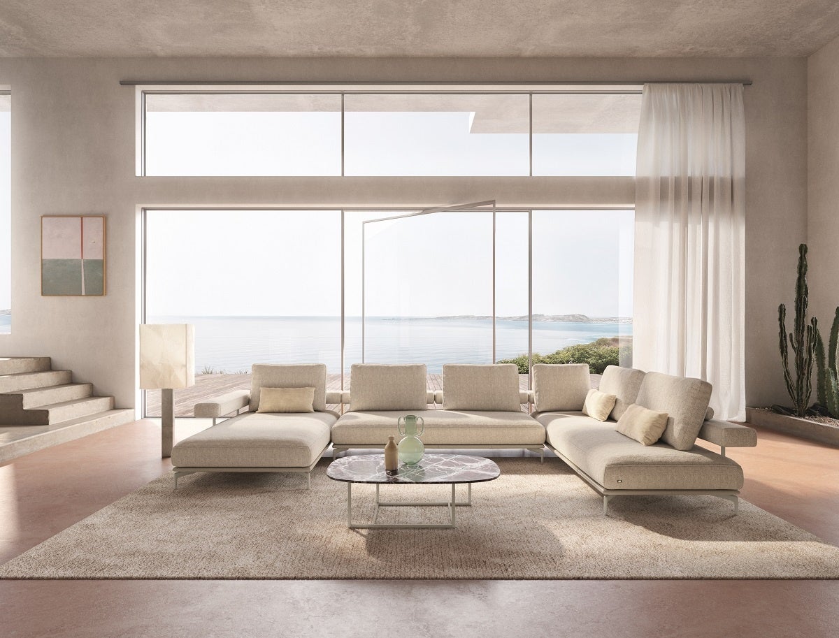 シャープな印象のフレームに支えられたシートクッションと、背もたれとの間に設けられたゆとりが、視覚的な軽やかさと空間の広がりを演出します。さらに、バックレストとアーム部分はそれぞれ10cm拡張することが可能。奥⾏きのある座⾯により、深くくつろげる快適性をもたらします。