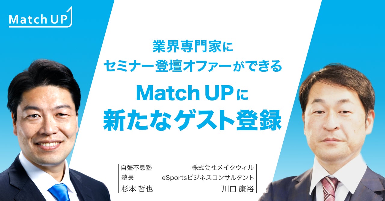 業界専門家にセミナー/イベント登壇のオファーができる「Match UP」自彊不息塾 杉本 哲也氏、株式会社メイクウィル 川口 康裕氏などが新たにゲスト登録!