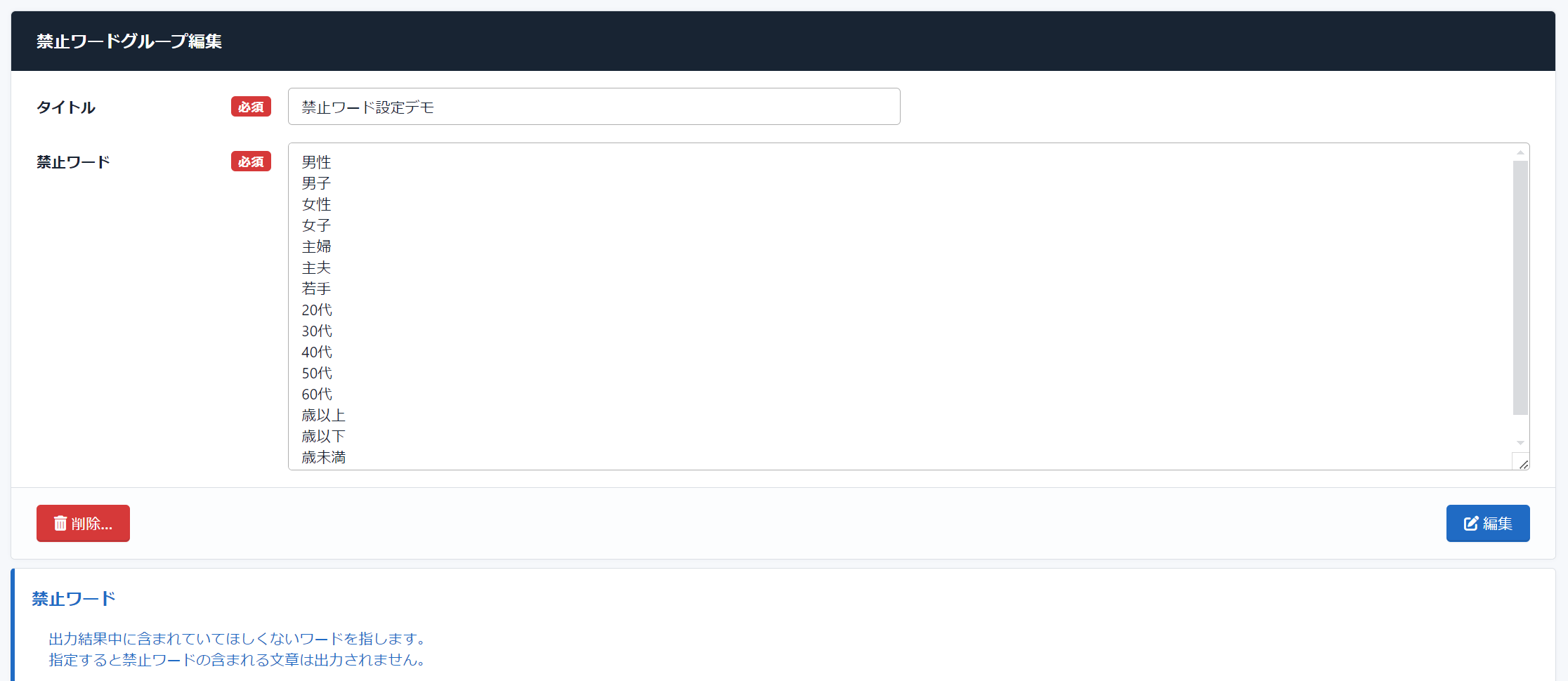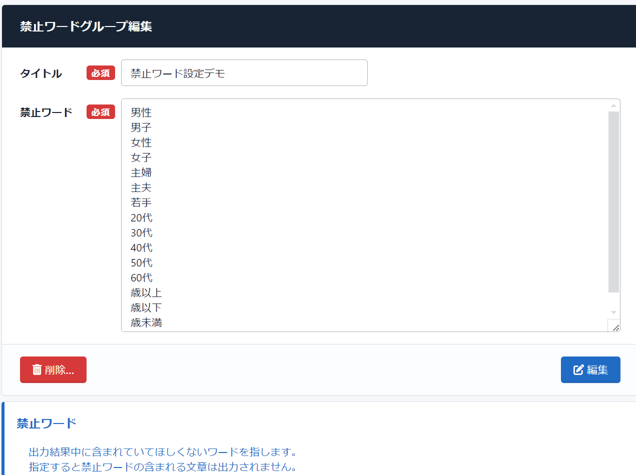 1種類の禁止ワードグループで対応出来る幅が広がりました。