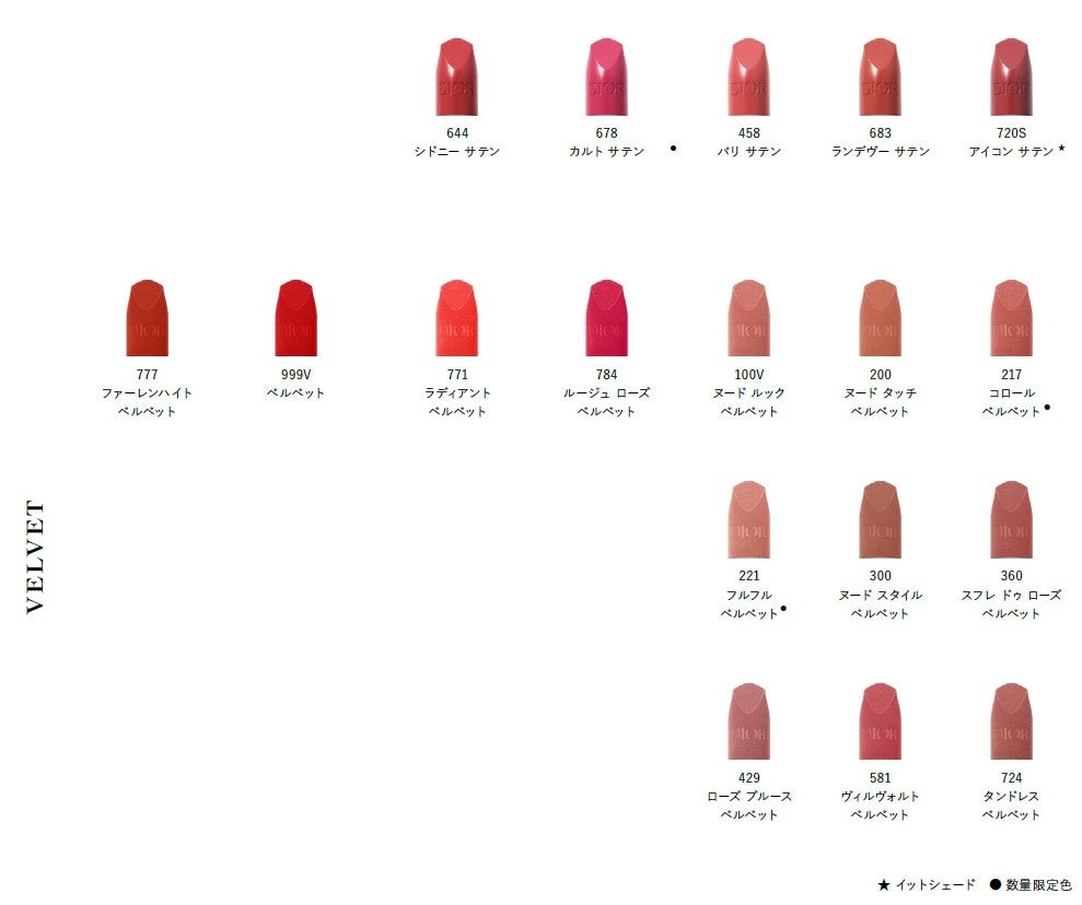 ベルベット:ベルベットのようなルミナス マットの仕上がり。驚くほどソフトなタッチで唇を柔らかく包み込み、ふっくらとした厚みを感じさせます。マットでありながら驚くほどに軽やかで快適な使用感で、美しい発色が一日中持続します。