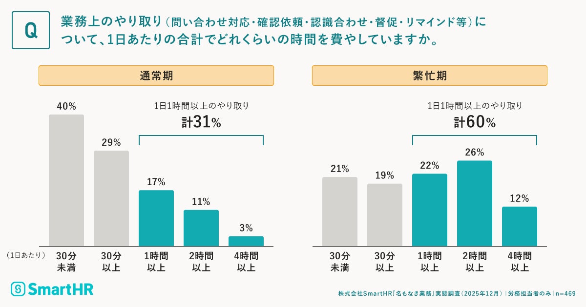 繁忙期、担当者の約6割が「1日1時間以上」を従業員とのやり取りに費やす